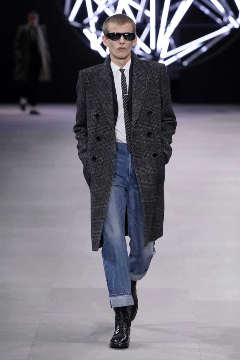 Un diario londinese, fatto di polaroid che ritraggiono i giovani britannici. Eccola la collezione che completa quello che è il guardaroba maschile secondo Hedi Slimane, penna che firma le nuove collezioni di Cèline. La forza di Slimane non sta tanto, solo, nel disegnare vestiti. Ma di creare un atteggiamento. Un’attitude desiderabile che fa desidere quello di cui si veste. I ragazzi androgini forse un po’ troppo magri hanno le mani sprofondate nelle tasche si cappotti squadrati e giubbotti da motociclista, dentro a pantaloni dalla vita alta, biker pants strettissimi che si affacciano su calzini bianchi dentro a mocassini della London degli anni Settanta. Occhiali scuri e capelli da Mods. Slimane rafforza questa tendenza che si è vista sulle passerelle parigine e milanesi, di vestire di abiti sartoriali la nuova gioventù. Ecco allora doppipetto over su pantaloni skinny, cravattini strettissimi annodati su colletti di camicie bianche, giri di sciarpe scozzesi alla gola e tocchi scintillanti su bomber cortissimi e cappotti piombati con accenni animalier.