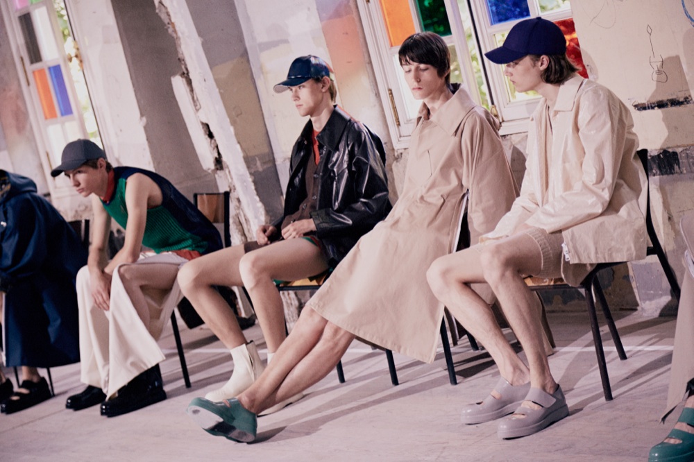 Ma a Parigi è arriva anche la Swedish Summer. È la presentazione di Acne Studio che porta in scena un nuovo minimalismo romanitco. L’ispirazione è quella delle vacanze in tenda. Le linee dritte, le nuance dle sottobosco e i materiali waterproof sono protagonisti su raincoat jacket e parka over con cappuccio, poncho e capisapalla con linee ampie che accolgono camicie in popeline di cotone, polo chiuse fino al collo con la zip e maglioni a righe che ricordano i costumi da bagno degli anni venti.
