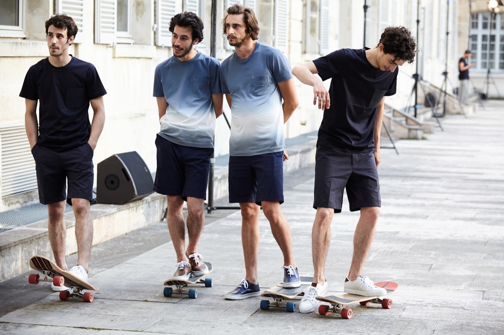 Una presentazione informale, nel cuore del Marais, invec per la nuova collezione di Sandro Paris. Ilan Chetrite immagina un marinaio vagabondo che viaggia per mari, porti e città. È dal mondo nautico infatti che arrivano i tali e le proporzioni fluide, i pantaloni alla caviglia con ampie pince e camicie azzurre, doppipetto e giacche due bottoni indossate su t-shirt tecniche rigorosamente a righe. I materiali sono leggeri e mettono in evidenza vita e spalle mentre le scarpe in cuoio hanno suola a carrarmato.