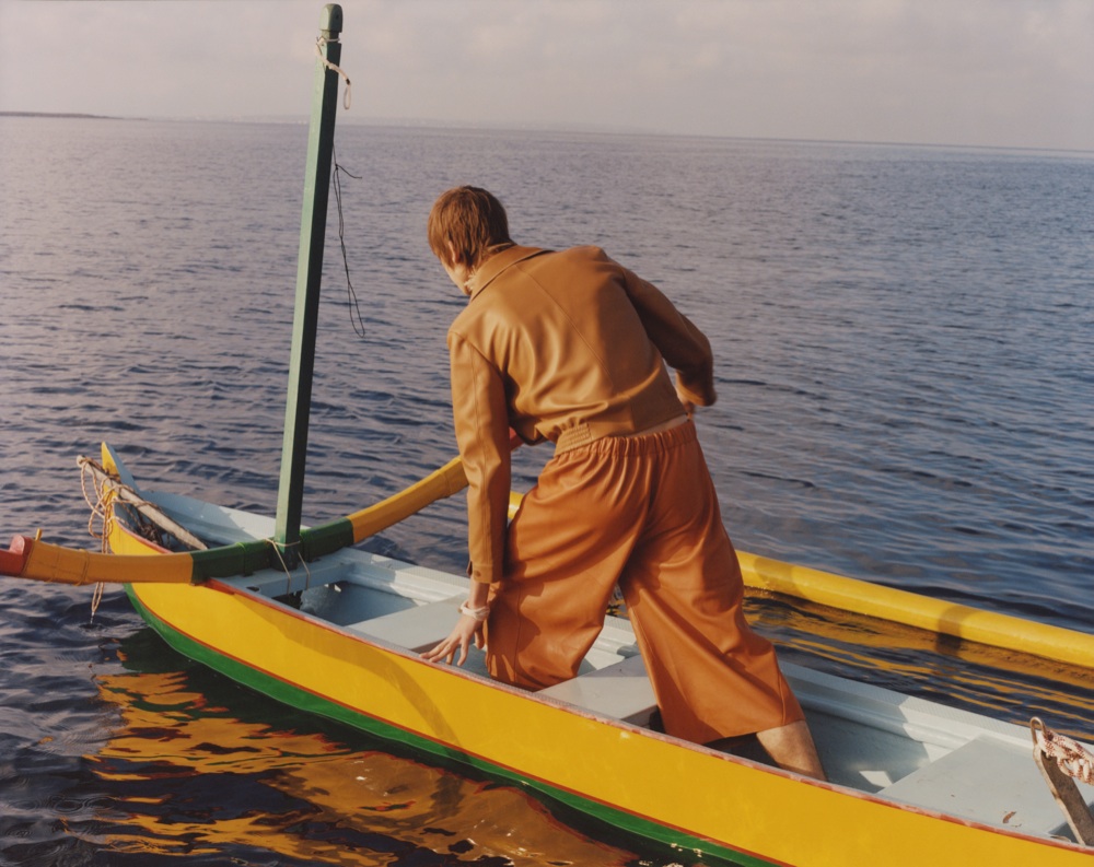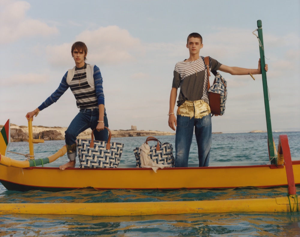 Ancora il mare al centro del viaggio del nuovo uomo della prossima stagione. Sembra di approdare su una spiaggia deserta dopo aver naufragato per giorni nel Mediterraneo nello showroom Loewe di place Saint Sulpice. L’immagine di un tramonto dalle sfumature oro e nere ricopre le pareti, mentre un pavimento di piastrelle nere smaltate regala l’impressione di camminare su acque illuminate dalla luna. La nuova collezione di Jonathan Anderson racconta una storia di pescatori, immaginando due giovani isolati in mezzo alla natura. I tessuti così sono organici, lino, spugna, seta morbide e leggermente bohemienne, si abbinano poi a giacche traspiranti e idrorepellenti. Tra le decorazioni: antichi fossili e monete ricamate in silicone, cromature a immersione e gioielli in legno ispirati agli utensili del XIV secolo.