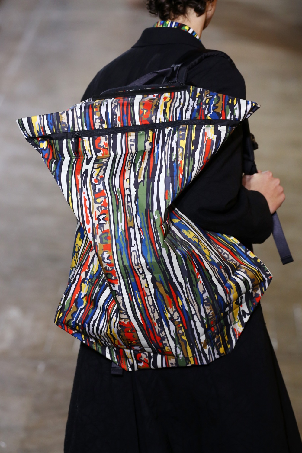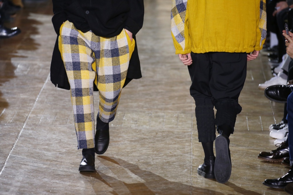 Con un po’ più di vita, in una foresta di betulle bianche, prende vita invece la collezione di Issey Miyake. Un ritorno alla natura, all’outdoor, e di nuovo, come già visto a Milano, al trekking. Materiali organici, tessuti in nylon antipioggia, taffeta di seta e inserti in poliestere. Le texture sono quelle delle cortecce delle betulle create sovrapponendo lastre di stampa o intessendo cinque diversi fili colorati. Sfilano poi i macro check, quadri gialli e blu, intrecci di lana cardata con sottilissimi fili riflettenti.