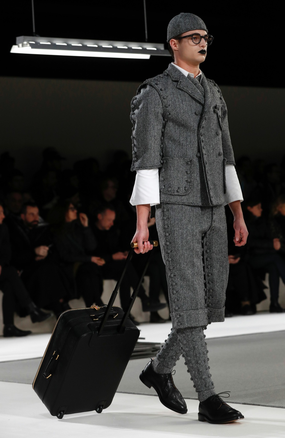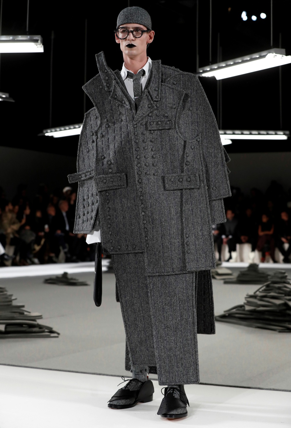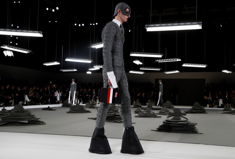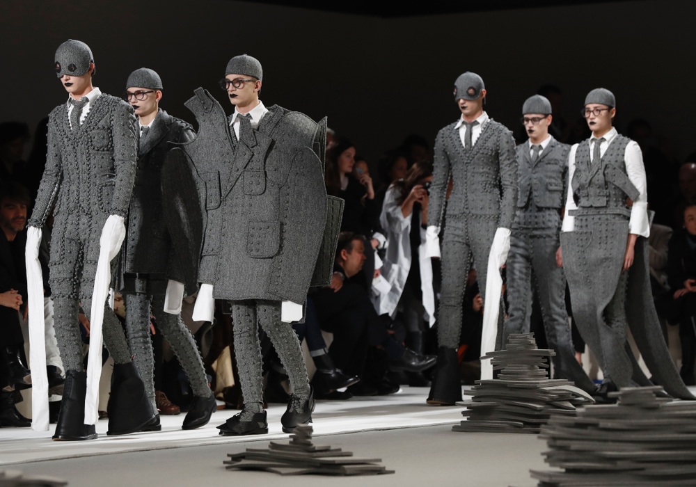 Meditazione sull’abito grigio. Una rappresentazione quasi scultore della lentissima arte del tailoring si è messa ben in mostra, nell’ultimo giorno della moda parigina, sulla passerella di Thom Browne. Monocromia assoluta, un défilé di una lentezza estenuante che ha messo alla dura prova già una provata fashion people. Abito grigio come tema unico. Ma con un’approfondita maniacalità. Quarantaquattro uscite, tre macrogruppi tematici. Dall’idea dell’abito, al cartamodello in due dimensioni, fino all’abito finito. Un gioco di proporzioni e riedizioni di un classico del guardaroba maschile. Un racconto dettagliato dei punti sul quale si costruisce un abito sartoriale.