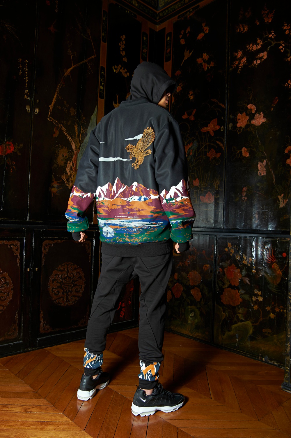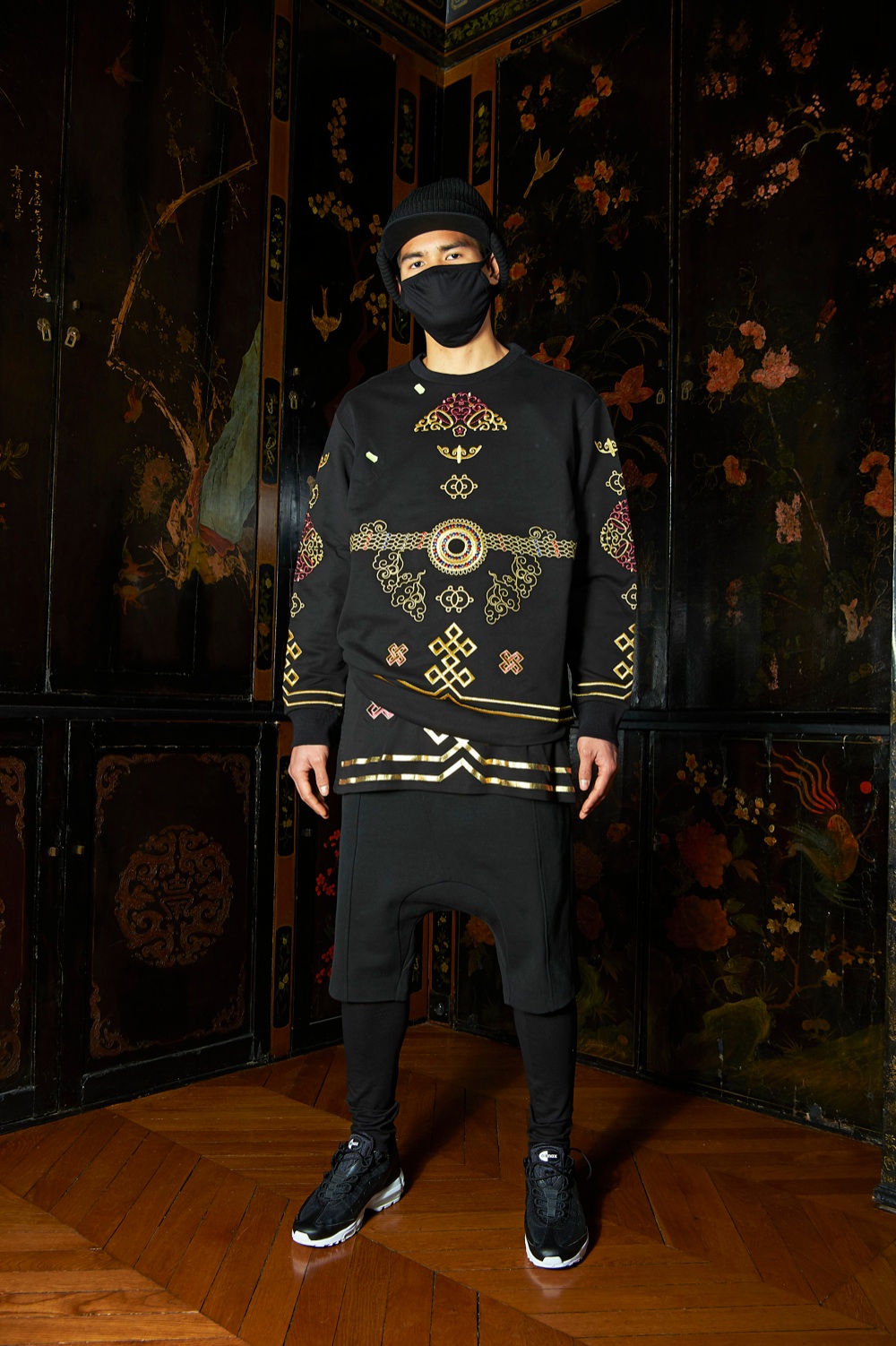 Di nuovo ispirazione alla natura, questa volta Les Benjamins che omaggia l’arte della caccia con le aquile un antico rituale che si compie dalle steppe verso la catena montuosa dell’Altai, in un patchwork elaborato di dettagli etnici ispirati al barocco. Da qui il guardaroba: ocra, bordeaux, sabbia su cui ritornano di nuovo slogano come Hunt, caccia, The Horseman Country, il paese dei cavallerizzi e Great Eagles Fly Alone, le grandi aquile volano da sole, incisi come emblemi industriali sul jersey di cotone double-face, e velluto francese.