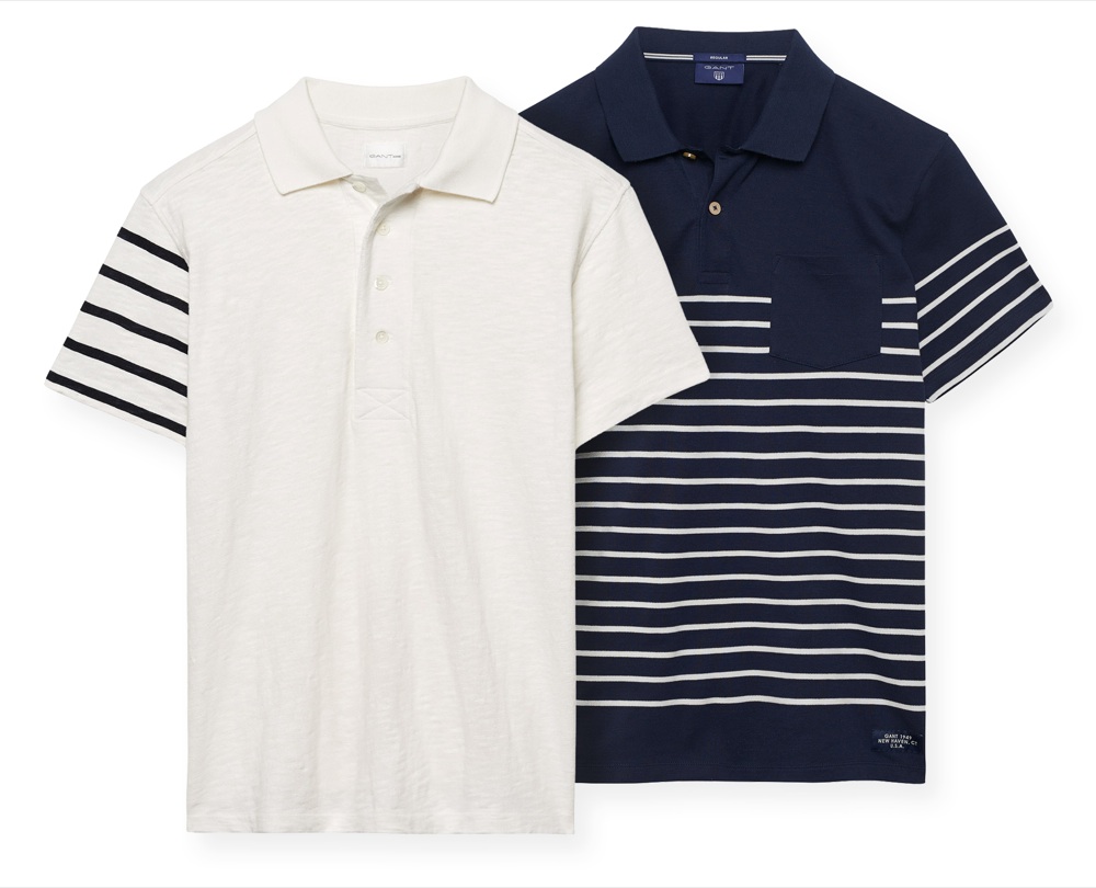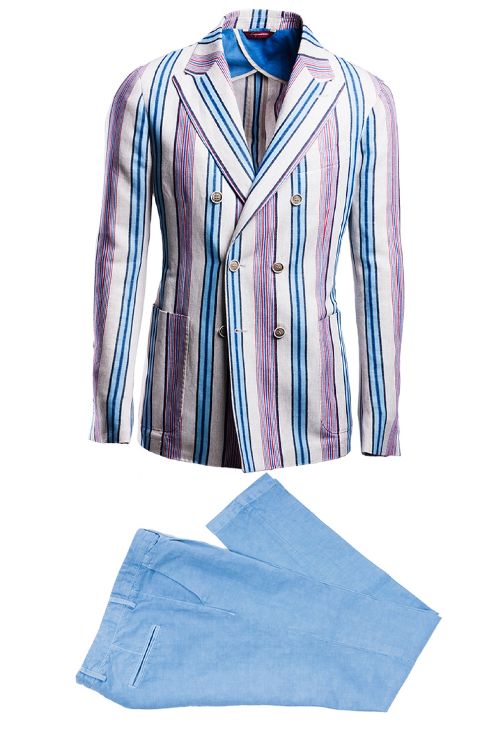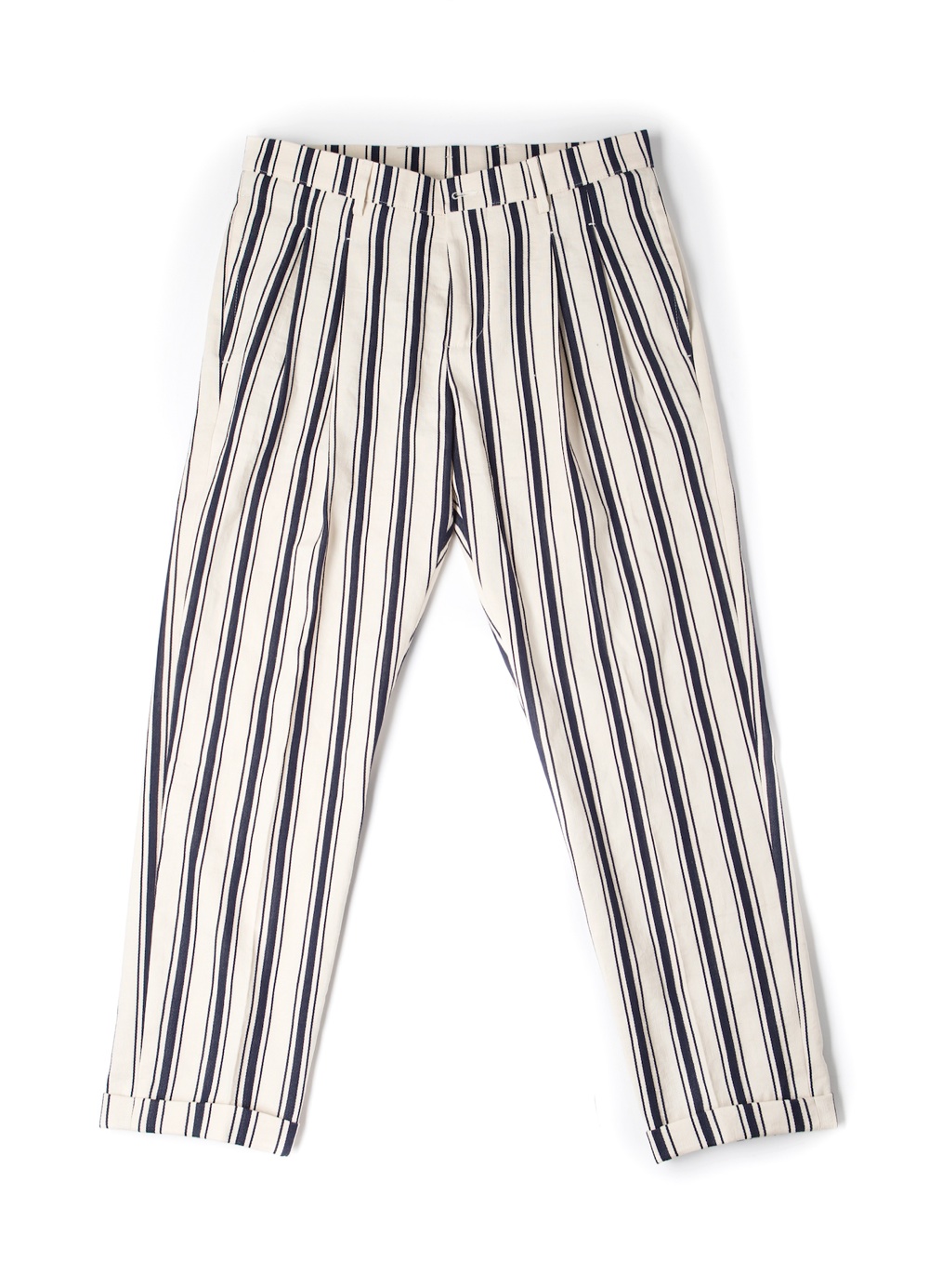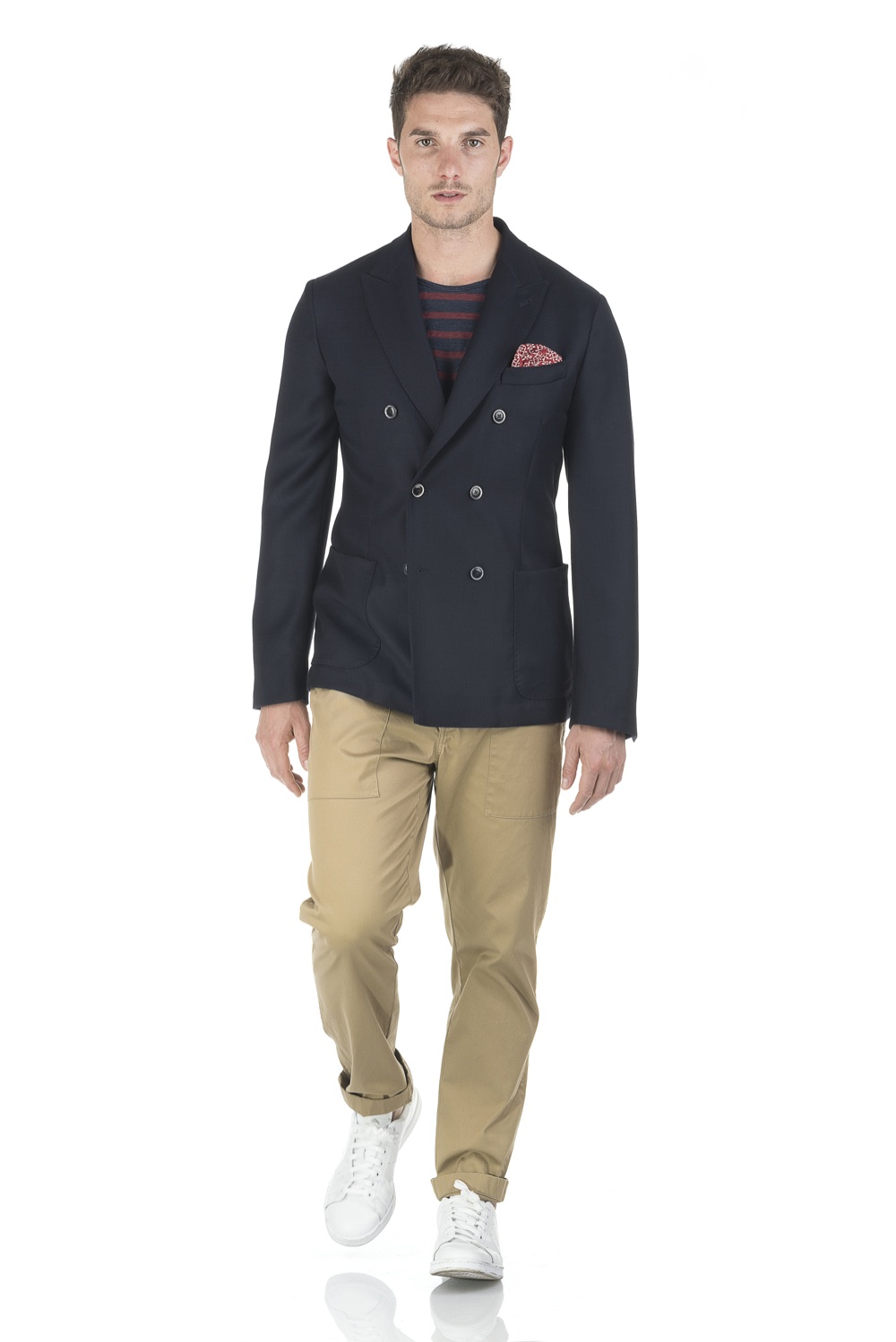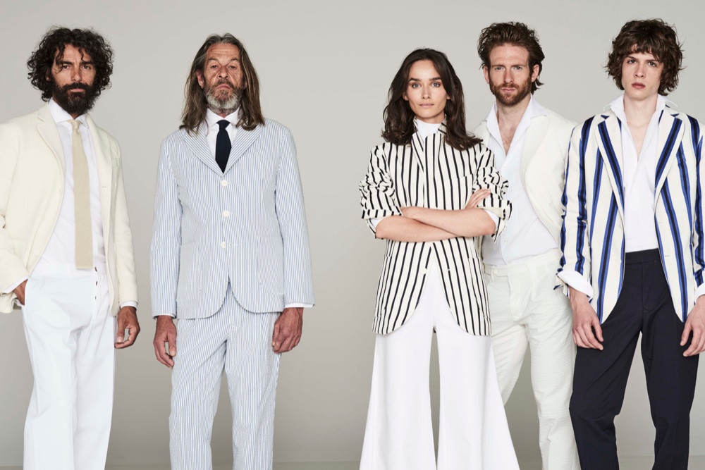 Il tutto è una mescola di rigore e fantasia su pantaloni sartoriali di tagli minimal con doppie pinces e giacche tre bottoni in cotone organico. La polo in pique si reinventa prendendo il posto della camicia, forgiata da filati preziosi, si porta con i classici doppiopetto d’ispirazione marìniere. Ovunque dominano le righe, sui pantaloni con sfondo ecrù e sulle maglie di cotone a maniche lunghe, sulle camicie in seta, sui panama, sui calzini e negli accessori da spiaggia.