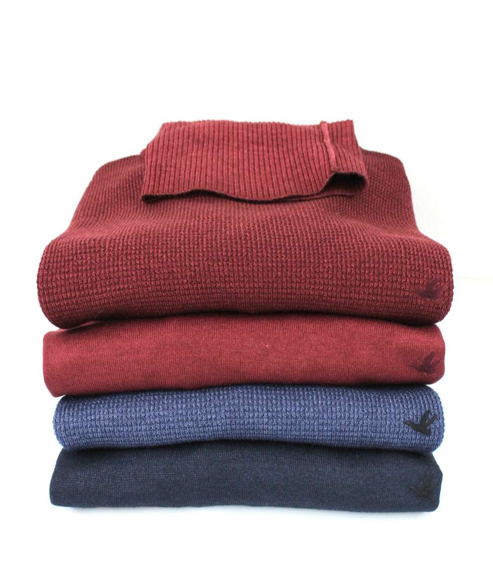 I toni sono quelli classici del blu navy unito a contrasto al filato stampato del beige ma anche quelli freddi del mare d’inverno: grigio, celeste, avio e navy, mescolati ai toni più caldi della terra, beige, rosso, burgundy e verde fango.