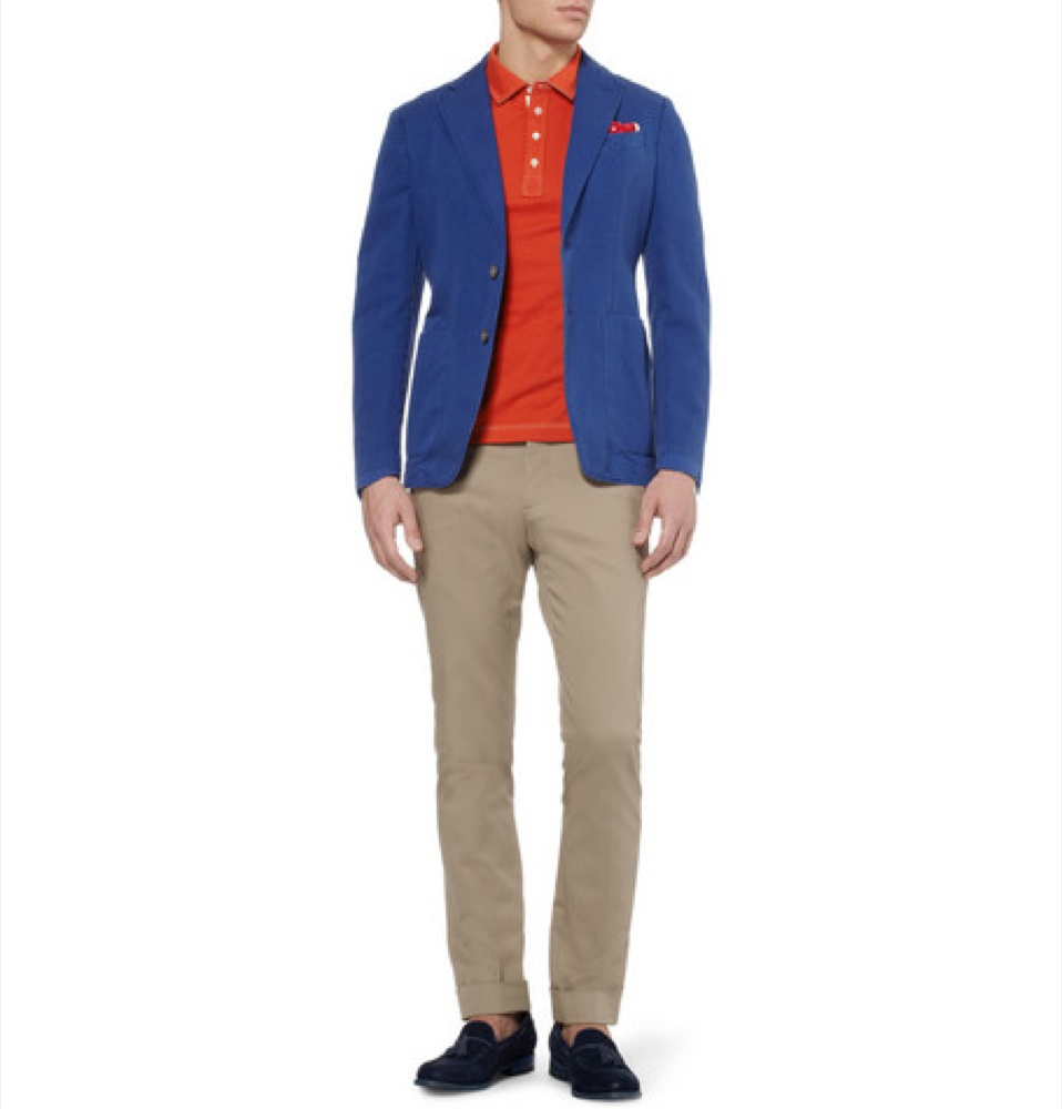 C’è anche chi osa indossando giacca e pochette anche in tenuta da spiaggia: Ralph Lauren propone un look estivo con costume, espadrillas, polo rosa e giacca blu con fazzoletto in tinta. Perfetto per l’aperitivo in riva al mare.