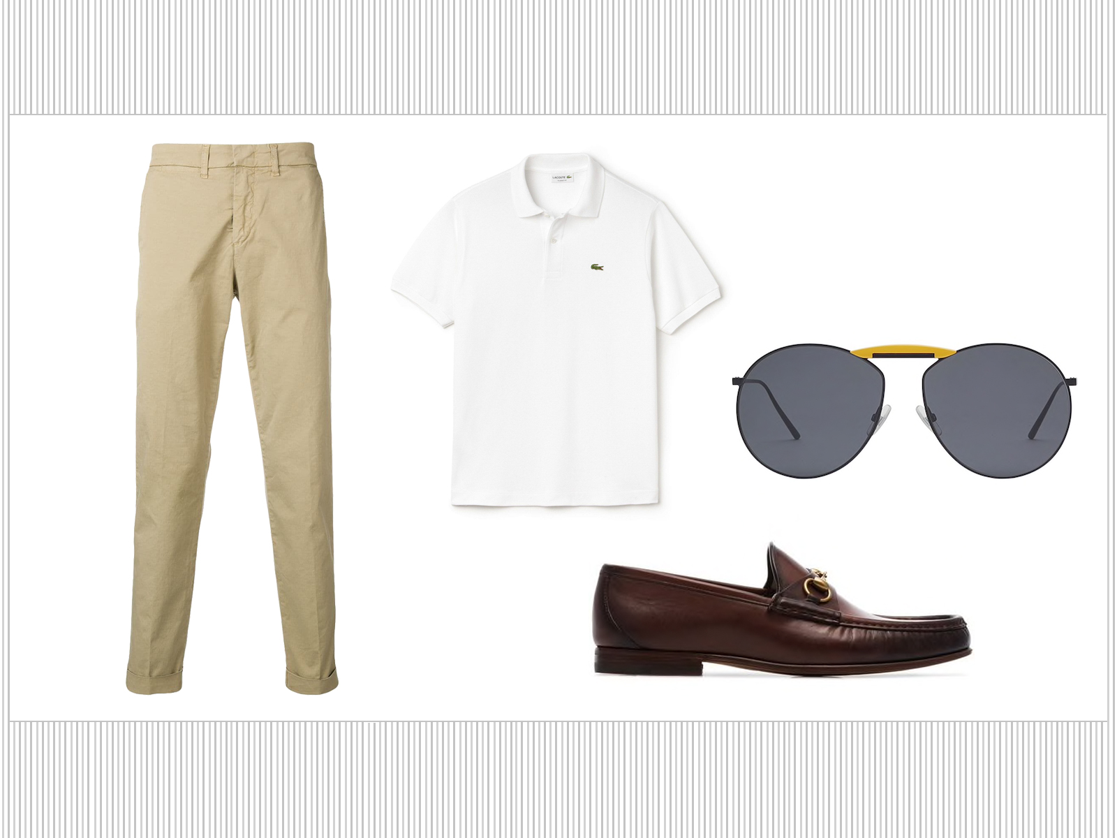 Un look essenziale e raffinato, composto da polo bianca in piqué di cotone [Lacoste], pantaloni chino beige [Fay], mocassini in pelle marrone [Gucci] e occhiali da sole con montatura rotonda in metallo [Fendi], è l’ideale in ogni occasione.