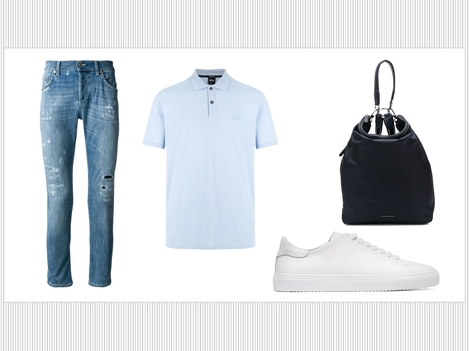 Nel tempo libero una classica polo con i bottoni e logo sul petto [Boss Hugo Boss] si abbina alla perfezione a jeans con gli strappi [Dondup], sneakers in pelle bianca [Axel Rigato] e zaino con le spalline regolabili [Ermengildo Zegna].