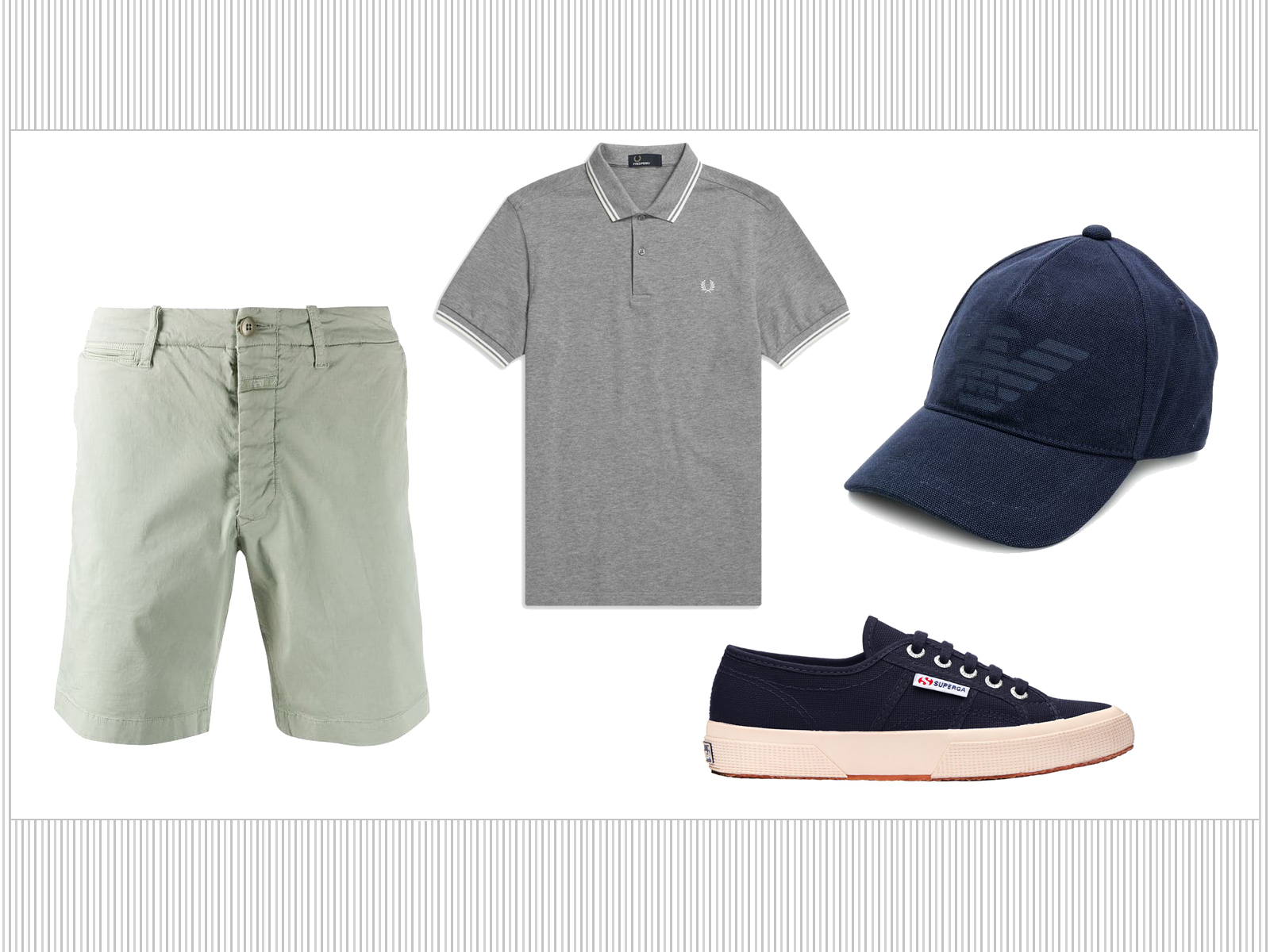Quando la colonnina di mercurio sfiora i 40°, via libera alle polo leggere, come questa in grigio melange [Fred Perry], abbinate a bermuda con le tasche laterali [Closed], scarpe in tela [Superga] e cappellino con visiera [Emporio Armani].