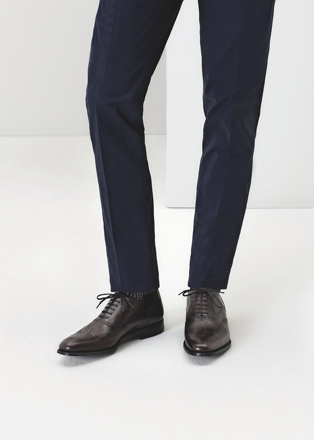 A disegnare lo stile delle nuove calzature maschili sono i dettagli: le impunture, i tratteggi che decorano e disegnano la tomaia, le punte a code di rondine, il doppio cuoio di sostegno nel contrafforte, i fori degli occhielli realizzati manualmente. E le cuciture a guardolo, vero sinonimo di qualità. Seguendo il metodo brevettato da Charles Goodyear, prevedono fino a duecentocinquanta punti cuciti a mano con un doppio filo intriso di un grasso che lo ammorbidisce e lo rende resistente e impermeabile. Nel fondo viene inserita un’intersuola in sughero che, oltre a garantire la traspirazione, si adatta all’anatomia dell’impronta, come fosse un plantare.