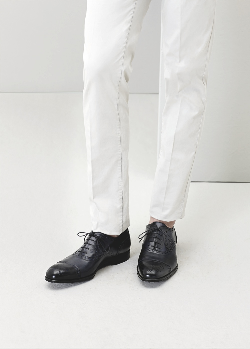 I colori vanno dal classico nero all’ebano. Tabacco, testa di moro fino al deep blu ispirato al denim. Hanno lavorazioni chiamate Toledo il colore viene applicato e steso direttamente sulla tomaia grezza) e rifiniture all-over per cui ogni dettaglio della calzatura assume la stessa nuance della pelle. Qui il guardolo viene dipinto a mano con un pennello e la lissa, l’orlo della suola, viene cerata per far risaltare il colore. Si indossano con pantaloni a gamba stretta, con l’orlo che sfiora la tomaia lasciando intravedere la curvatura che incornicia la caviglia.