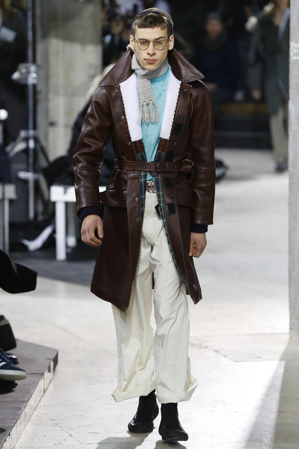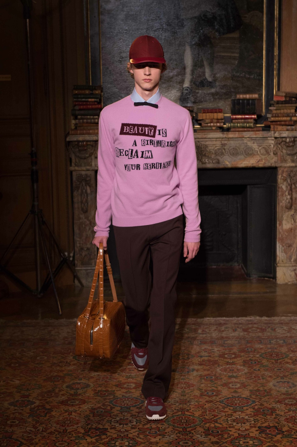 In analisi, la collezione è molto ordinata. I pantaloni si allungano, coprono parte della tomaia delle sneaker azzurre e arancio, rosa, bordeaux e rosso fuoco. I blousons sfiorano i ricordi di certi anni Settanta, macrocheck come plaid, striature animalier, vernice e casentino. E ci sono poi pullover in shetland, camicie plastron con un sottilissimo nastrino a mo’ di cravattino, portadocumenti e borse da palestra. La scheda colore è gentile nei toni: del verde menta (il più bello), dei blu, dei beige e di nuovo nel rosa. Più shock invece nel rosso fragola e nell’arancio nuance quasi fluo che illuminano una nuova strada più spontanea, senza troppe riverenze.