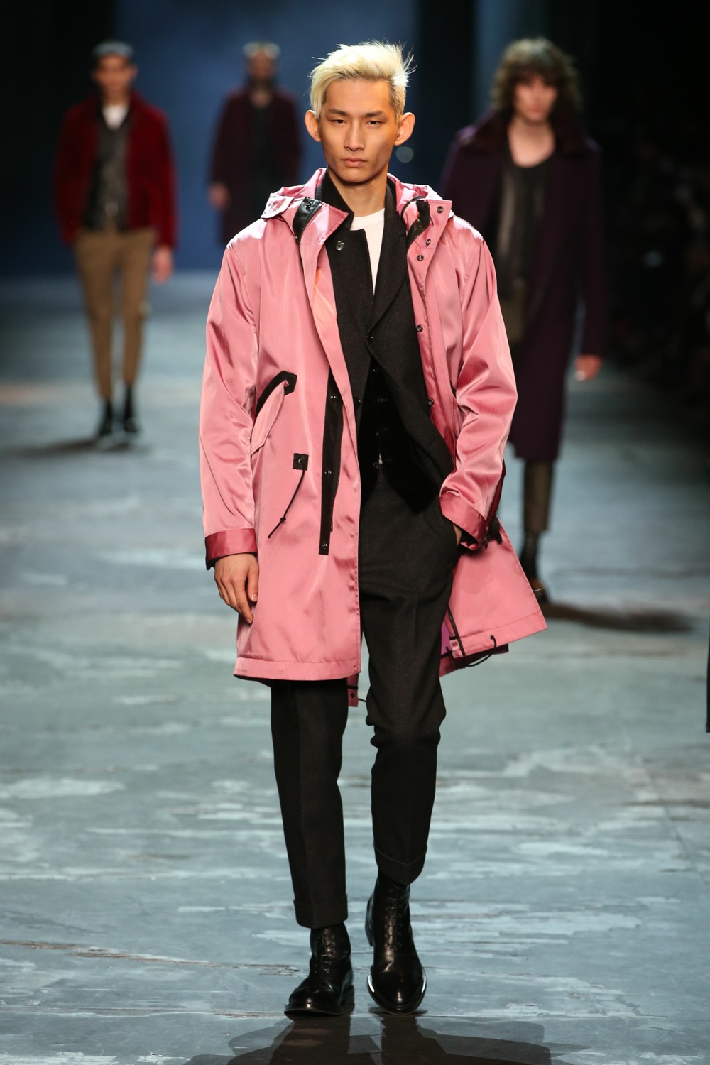 Debutto poi di Haider Ackermann a casa Berluti. Compito difficile quello di mantenere l’integrità del marchio pur mettendoci qualcosa di proprio. Che il nuovo direttre creativo della maison, appena entrata nel gruppo LVMH, ci sia riuscito? Sembra di si. La collezione è molto precisa. Capi chiave sono il camel coat e l’aviator jacket in pelle nera con inserti in coccodrillo rosso sul collo. Il giubbotto in nylon rosa foderato in cashmere e maglioni a collo alto ampi, senza cuciture, destinato a diventare una seconda pelle del prossimo inverno. Borsono da portare sottobraccio, completi in velluto e uno smoking blu reale da indossare anche di giorno.