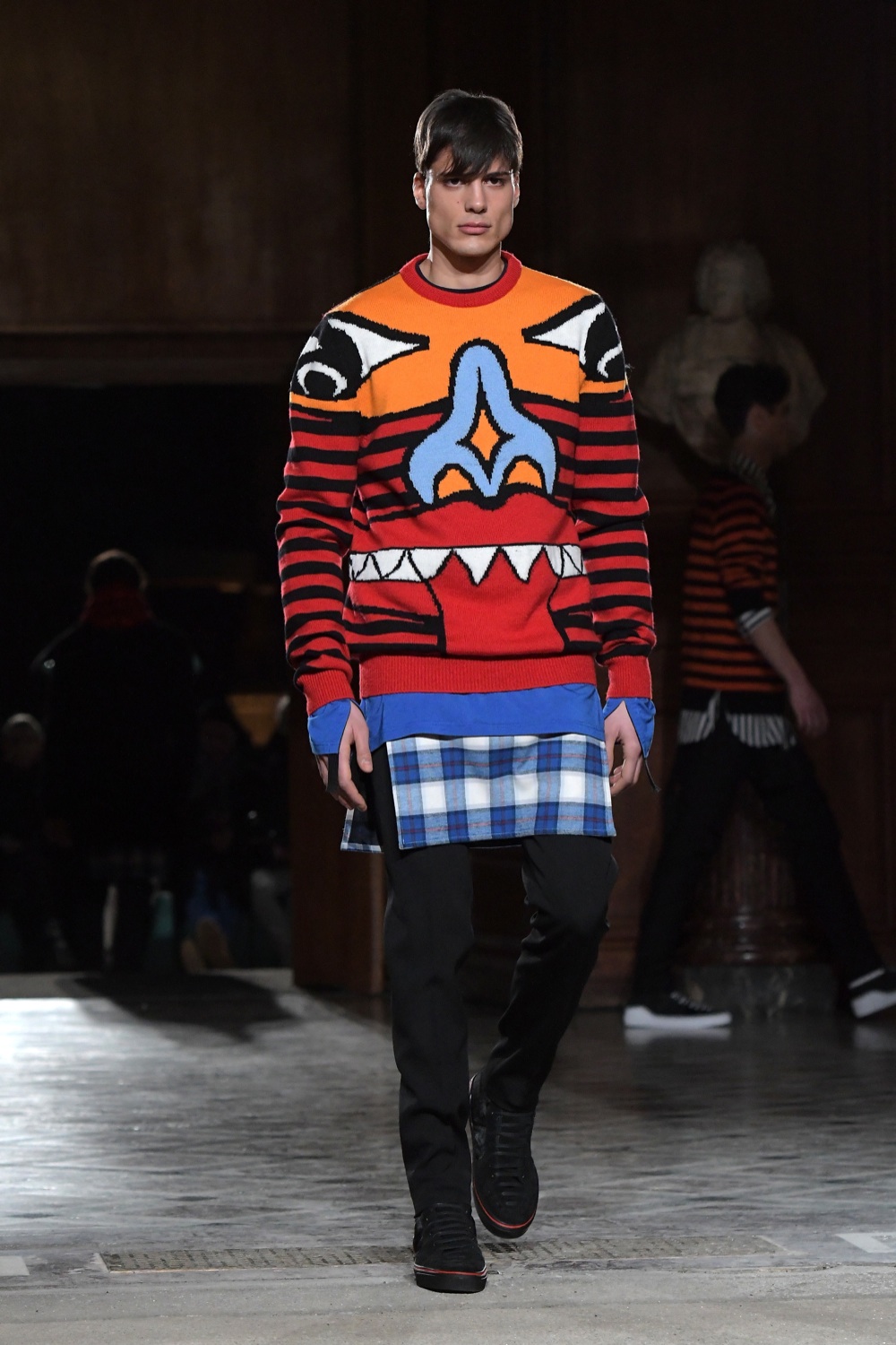 Riccardo Tisci da il via al suo defilè nell’istante in cui Donald Trump stappa la prima bottiglia di Champagne alla Casa Bianca. Concidenza vuole che la collezione di Givenchy sembra guardare proprio all’America, il West side, più che altro. Liberatosi del suo lato più dark Tisci disegna stelle e strisce e totem come maschere kabuki giapponesi su silhouette decentrate, forme allungate, stratificazioni di felpe, montgomery con ampi colli e doppipetto con bottoni come pulsanti. Attrazione magnetica poi verso le top scelte da Tisci e la sua casting director, Patrizia Pilotti. Con abiti vittoriani ecco così Bella Hadi, Kendall Jenner, Joan Smalls e Mariacarla Boscono.