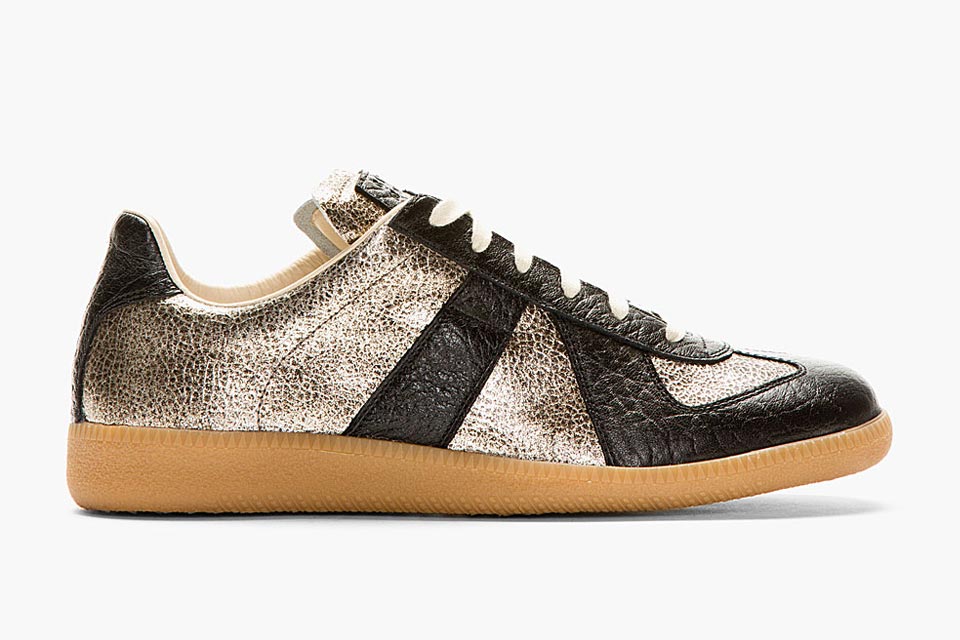Per le low-top della Maison Martin Margiela, originariamente prodotte per l’esercito tedesco, si parla più di contrasti: suola in gomma naturale e tomaia a effetto metallico. Jeremy Scott, invece, avvolge la bandiera britannica attorno alla tomaia in pelle pieno fiore e trasforma la classica sneaker in un accessorio da collezione.