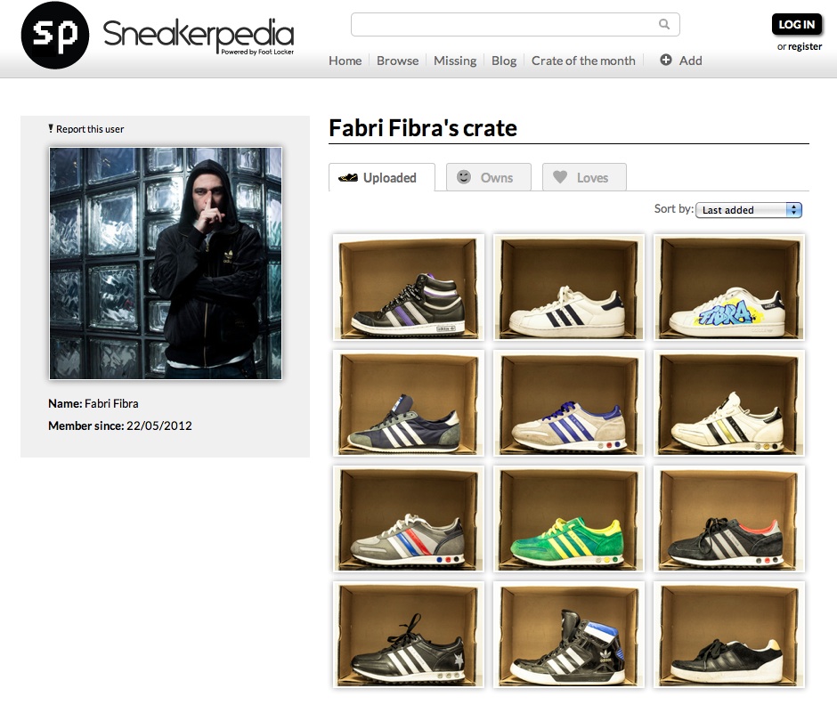 Per celebrare il primo anno di esistenza di Sneakerpedia, sono stati coinvolti personaggi come Fabri Fibra e Mr. Entics, che hanno caricato sul sito le proprie collezioni di sneakers: qui il Crate di Fabri Fibra