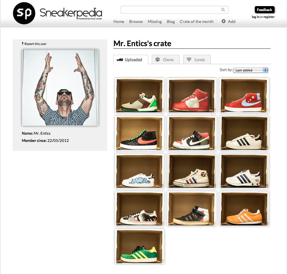 Per celebrare il primo anno di esistenza di Sneakerpedia, sono stati coinvolti personaggi come Fabri Fibra e Mr. Entics, che hanno caricato sul sito le proprie collezioni di sneakers: qui il Crate di Mr. Entics