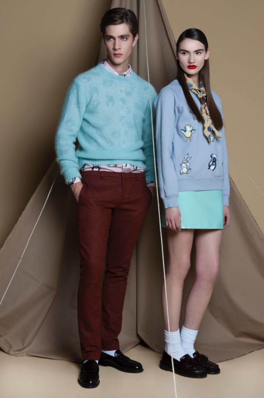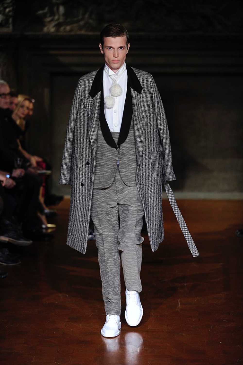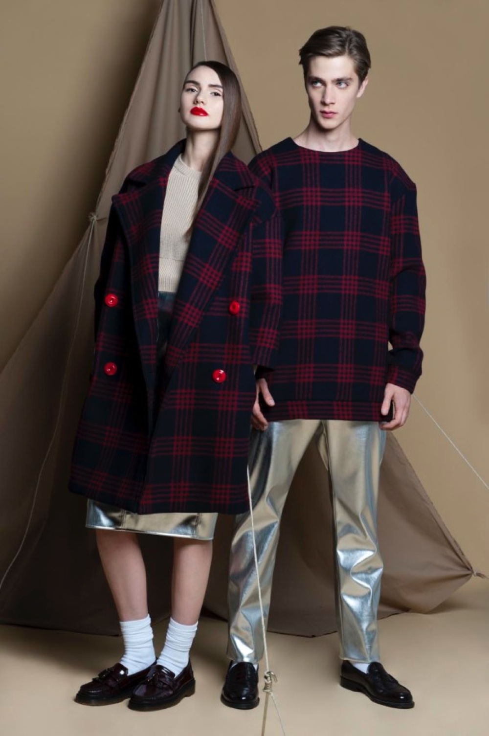 Gli Au Jour le Jour, duo creativo formato da Mirko Fontana e Diego Marquez hanno lanciato la linea maschile, Au jour le jour Garçon solo nel 2013 ma gli insider li conoscono già per il loro womanswear, passione di it-girl e stylist. A benedirne il percorso è stato addirittura Giorgio Armani che li ha selezionati tra i nomi nuovi, come usa fare ormai da qualche stagione, permettendo loro di sfilare nel suo teatro, sede storica dei defilè del marchio. Divertenti, autoironici, dissacratori, la loro moda dai molteplici riferimenti alla pop-culture e allo street style è epigone dello stile di Moschino, aggiornata al 2014. L’ispirazione per l’inverno viene da un boyscout dallo spirito eclettico, che indossa jeans délavé dall’aspetto vintage, decorandolo con patch iper-colorati. Lo spirito è sportivo, ma trova il suo perfetto contraltare in lavorazioni jacquard sul cachemire, stampe check e tweed di lana, motivi aspirazionali della più classica sartoria.