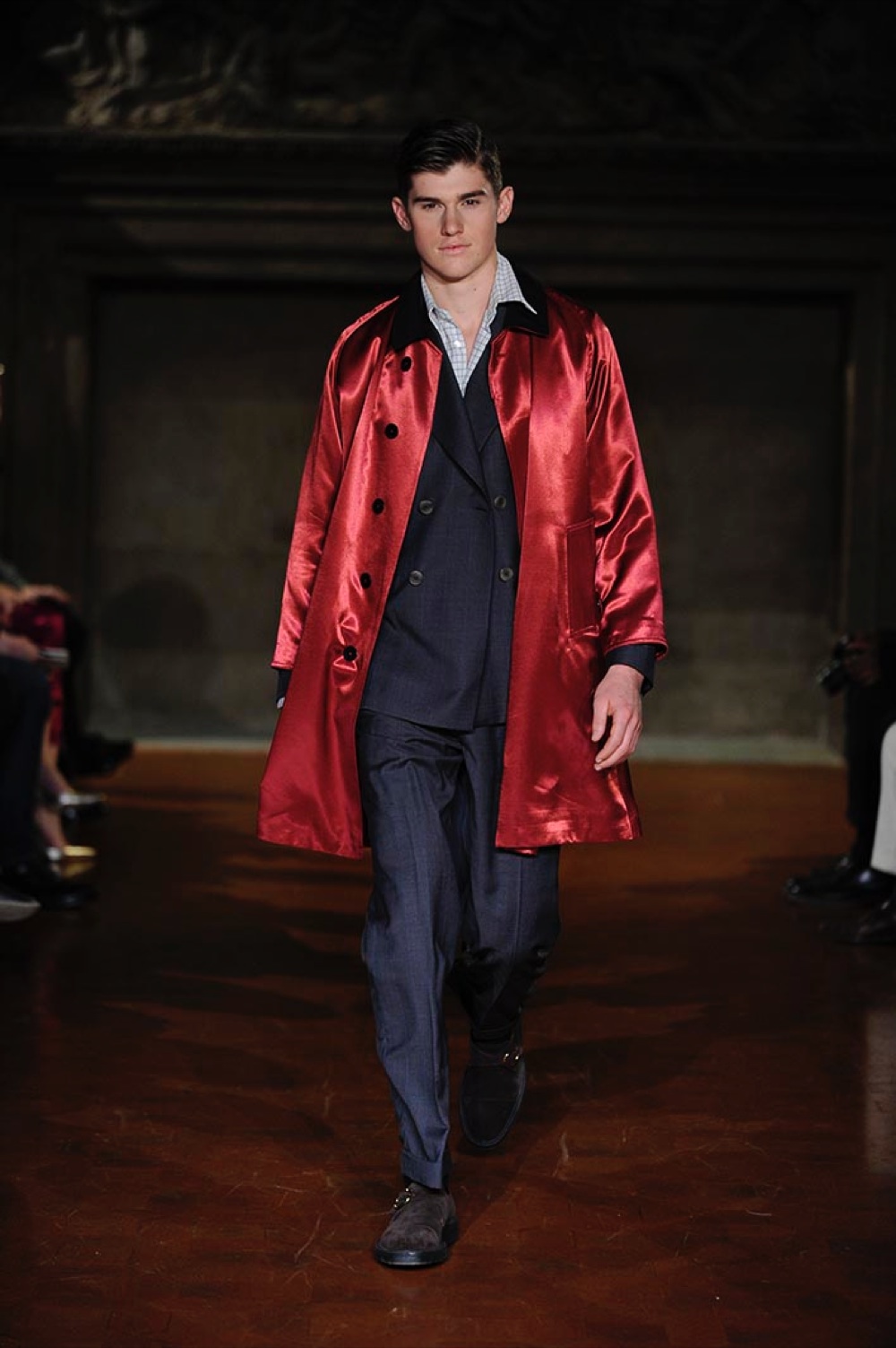 L’aretino Emiliano Rinaldi è invece un ingegnere prestato alla moda. Particolare di cui va fiero, e che gli piace ricordare persino nella targhetta interna dei suoi capi. Toscano, l’investigazione che predilige è quella sui tessuti, a cui regala consistenze morbide, stampe della tradizione fiorentina e allure da dandy in libera uscita. La collezione invernale infatti declina un classico dell’eleganza come il frac, in varianti adatte ad eventi informali, colorandolo di zaffiro e rosso rubino. I tre pezzi sono rilassati come pigiami da casa, ma dalle micro-stampe ricercate. Una cifra stilistica unica, che gli ha permesso da questo gennaio di divenire anche direttore creativo della nuova linea maschile del noto brand di intimo La Perla. (vedi anche il debutto maschile di La Perla con Emiliano Rinaldi)