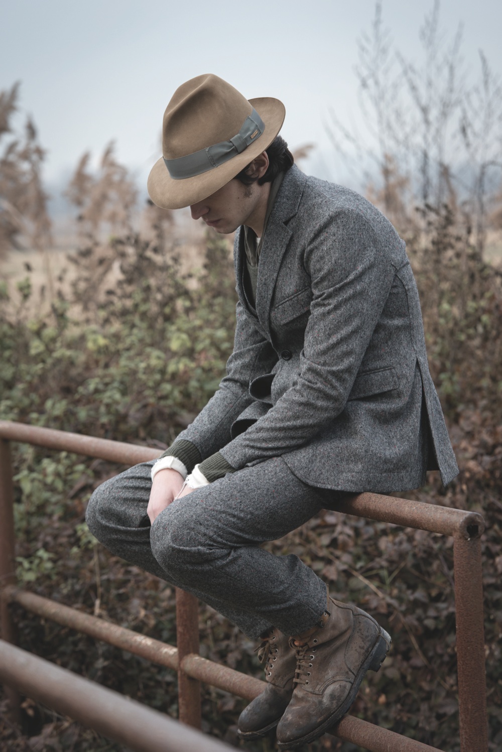Abbigliamento ma non solo. L’ispirazione workwear la fa da padrone anche nella collezione invernale di Super Duper, marchio di cappelleria interamente realizzata a mano, creato da Matteo Gioli, Ilaria e Veronica Cornacchini. A fare da protagonisti sono i gandy dancers, operai statunitensi dell’inizio del secolo scorso il cui principale compito era quello di allineare i binari. Compito gravoso, che sdrammatizzavano con canti gospel. Una consistenza materica venata di poesia, come nei loro cappelli, coppole in tweed e fedora in verde, blu, e grigio, che sembrano coperti da un sottile strato di polvere, a regalare un fascino vintage, ma inaspettamente urbano.