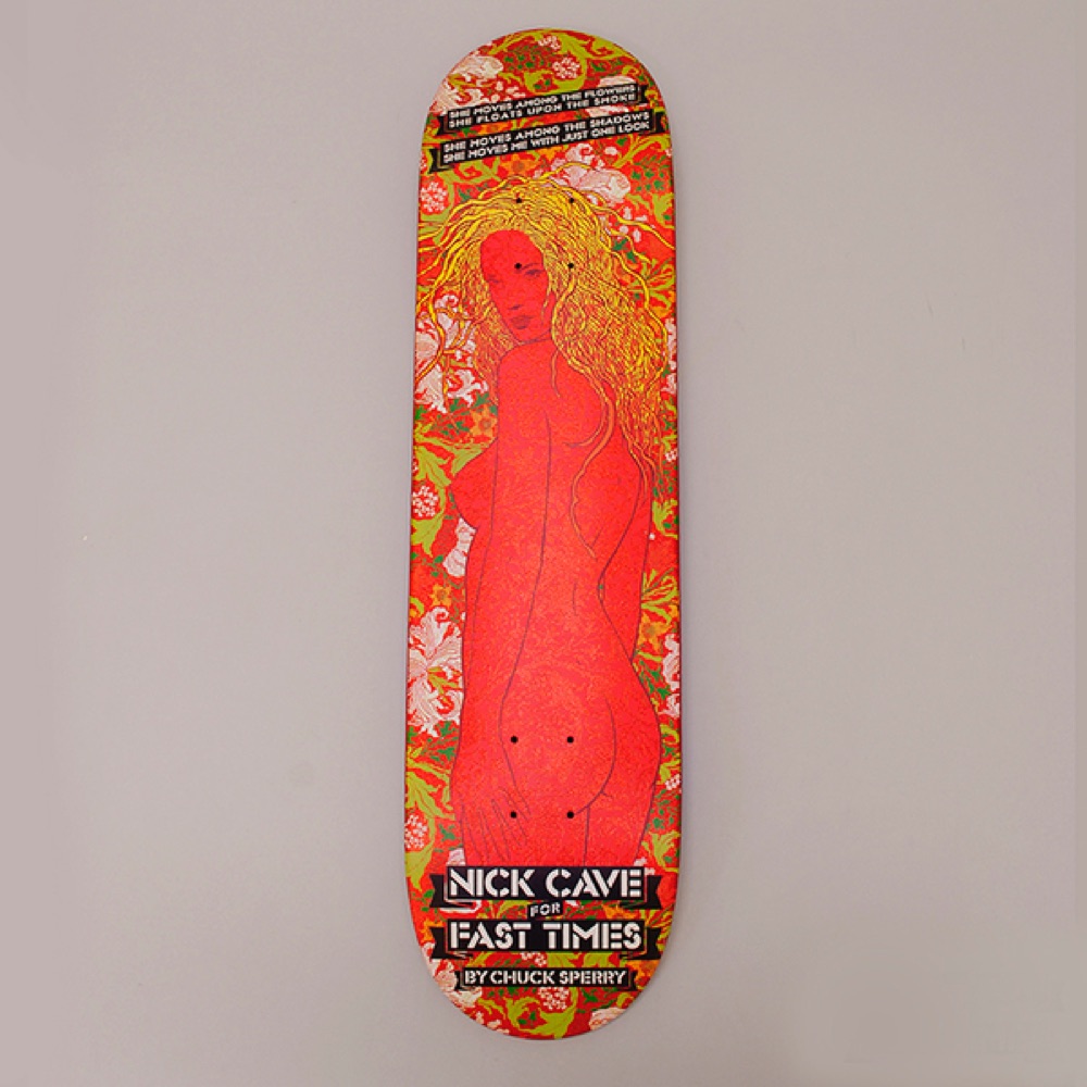 L’immagine è ad opera dell’artista di San Francisco Chuck Sperry, ma le parole che vi sono riportate sono, indubbiamente le sue: si parla dello skateboard di Fast Times, marchio australiano, prodotto in collaborazione con Nick Cave, l’artista che ha prestato la sua immagine e alcuni suoi versi della canzone Nature Boy (dall’album Abbattoire Blues, del 2004) per la realizzazione dell’oggetto, da subito divenuto cult (vedi anche il film dedicato a Nick Cave)
