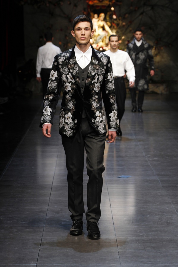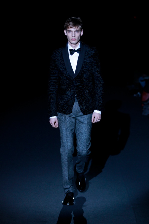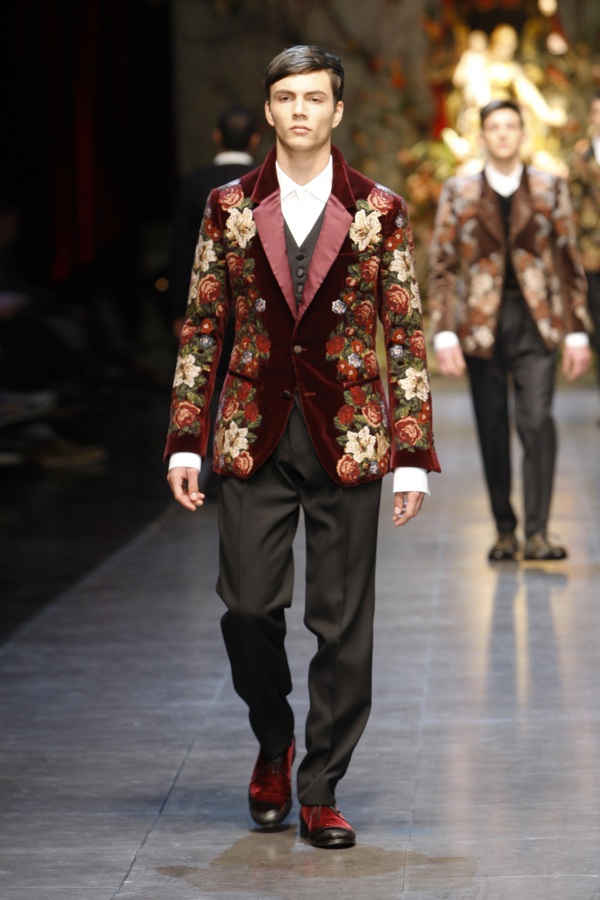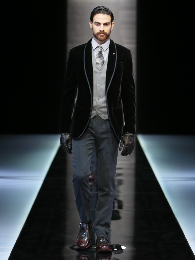 Primo ambasciatore è Giorgio Armani che plasma velluti soft-touch su giacche e pantaloni, fino a lunghi cappotti doppiopetto, come drappi regali, ornati di bottoni dorati e sottocolli in pelle. La devozione per gli abiti sartoriali di Dolce&Gabbana, invece, lo vuole ricamato o total black, anche su gilet, revers e tomaie di scarpe con punta rinforzata. Lo stilista Umit Benan, per la sua ultima collezione griffata Trussardi, lo propone a coste larghe, nei toni caldi del bosco d’autunno, e mai attillato, anzi le forme morbide ricordano che la giungla di asfalto è lontana e che la terra promessa del designer-cantastorie è la foresta. E infine lo ritroviamo da Gucci, nella sua versione più classica: rigorosamente nero, per la giacca da smoking con papillon.