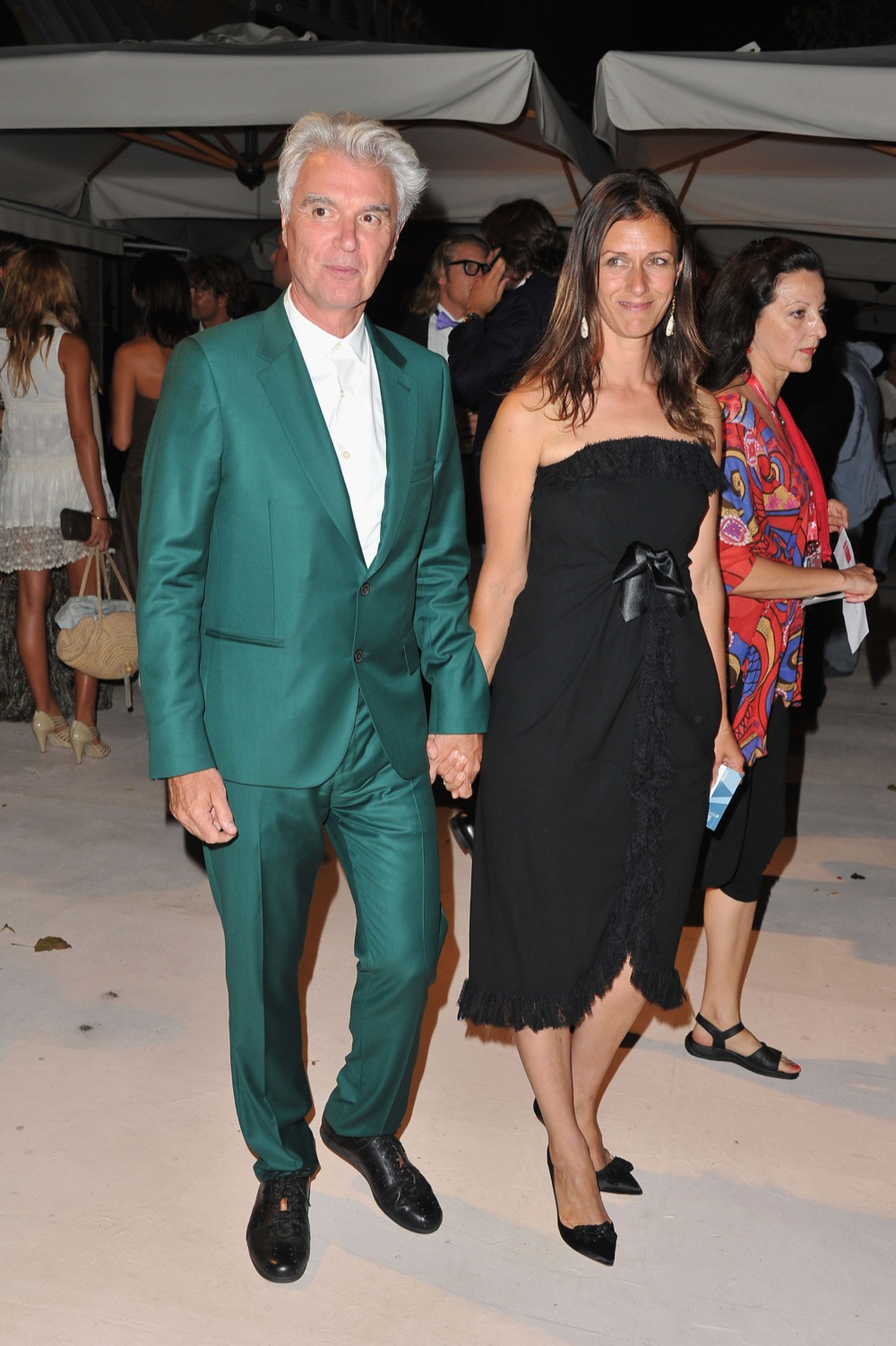 L’eclettico David Byrne, artista e fondatore dei Talking Heads, si concede una delle sue rare apparizioni in pubblico a Venezia, nel 2011, in completo verde smeraldo (Getty Images)