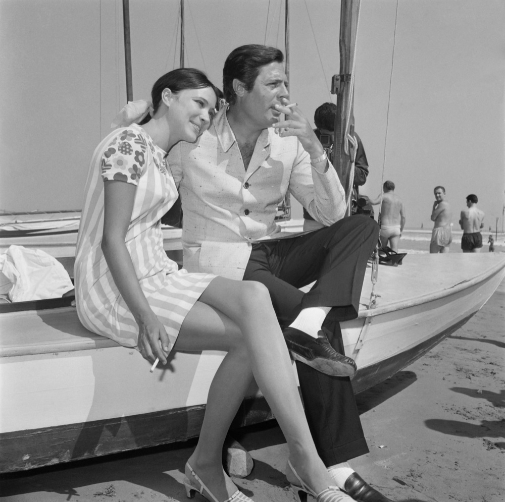 French actress Anna Karina and Italian actor Marcello Mastroianni, costars of the Luchino Visconti film “Lo Straniero” (The stranger), smoke cigarettes on September 6, 1967, seated on a boat at Venice Lido, during the Venice Film Festival. (Photo credit should read -/AFP/Getty Images)