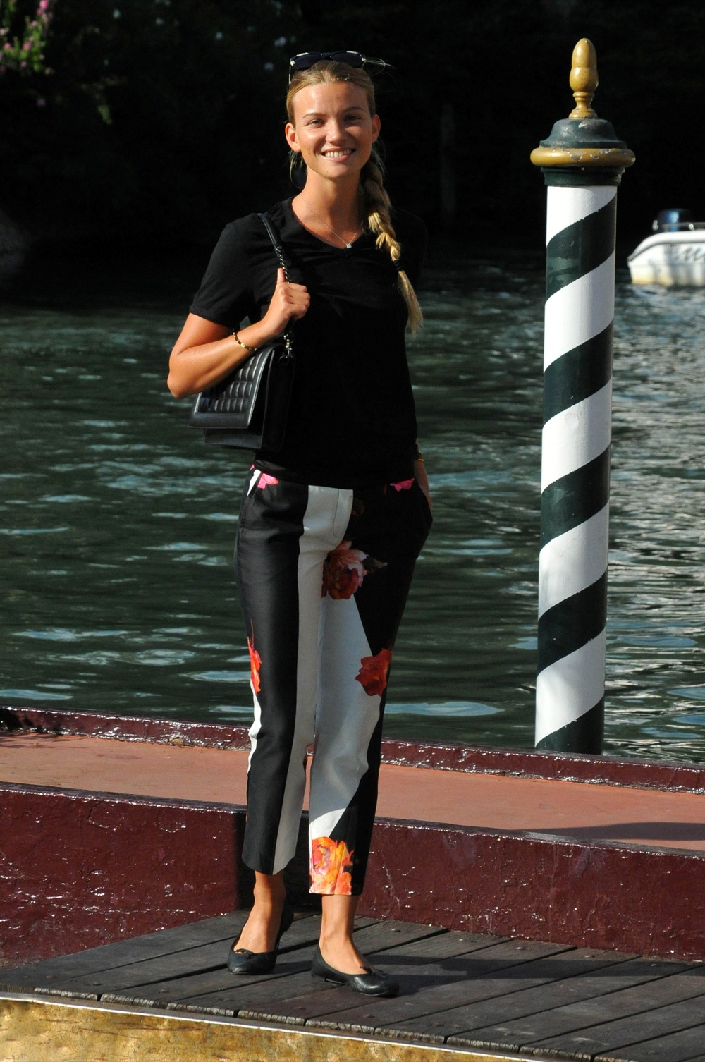 Lungo di sera, spezzato e basic di giorno. Fiammetta cicogna non sbaglia un colpo e dopo l’abito lungo verde del red carpet ha puntato per una mise decisamente soft e senza eccessi. Pantaloni in shantung di seta con la stampa più richiesta della stagione: black and white grafico con rose, tutto griffato Blumarine.