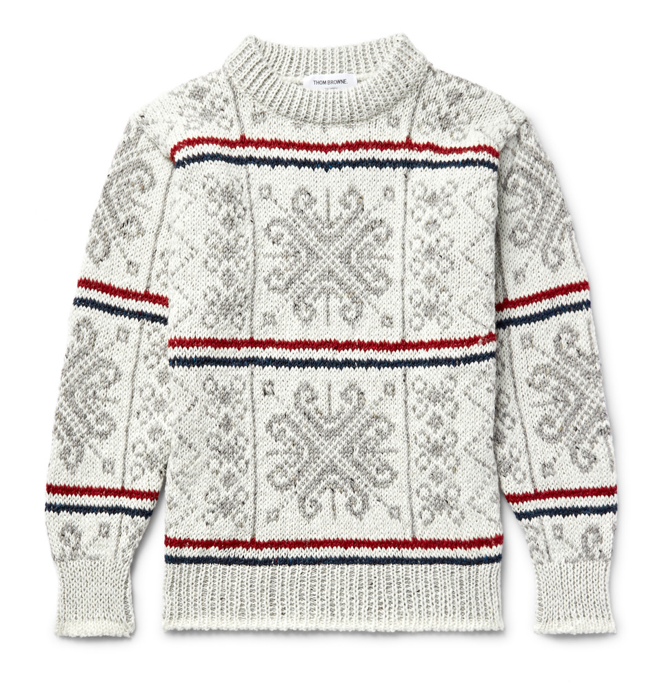 A riparare dal grande freddo ci pensa il parka in full sherling, leggermente cerato, di Lempelius manufactures, brand berlinese di capisapalla pezzi unici. Si porta con una camicia in cotone con stampa microcheck, come quella di Fradi o, per i piuù freddolosi, con maglione in lana mohair, come quello di Thom Browne, con motivi dedicati alla montagna e i nuovi denim Thermo + di Replay, dalla vestibilità regular, lavaggio medio scuro con leggero effetto marmorizzato, baffi carteggiati e lievi micro abrasioni che grazie alla trama Thermcool mantiene costante la temperatura del corpo. Si porta leggermente risvoltato sulla tomaia di mountain boots in pelle color testa di moro. Come quelli di Moncler, con lacci a contrasto, da cui spuntano le calze della collezione natalizia di Gallo.