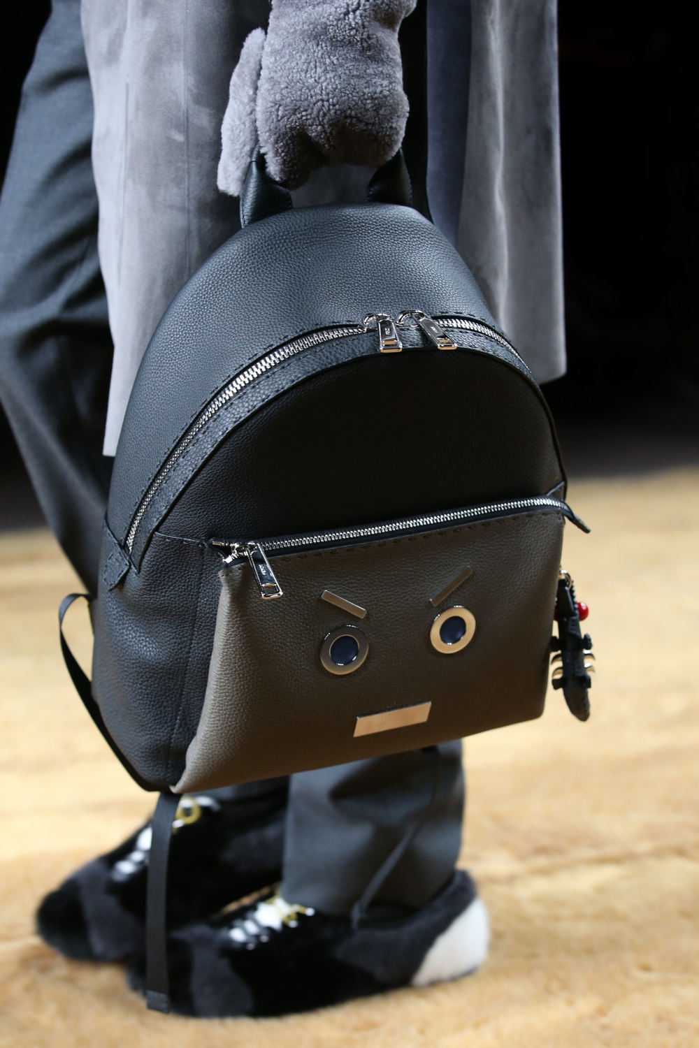 Divertente quello di Fendi che ha sfilato in passerella insieme a borse peluche e sneaker mobide come pantofole. Lo zaino in nylon ha tasca anteriore con chiusura a zip in pelle di vitello tono su tono con applicazioni in metallo satinato e dettagli smaltati blu e neri che compongono l’animoticon ‘No words’. Spallacci in nylon e dorso in rete tecnica trasparente da indossare con felpa e denim o, come in sfilata, da portare a mano come una sacca.
