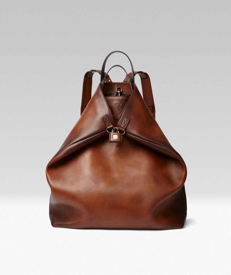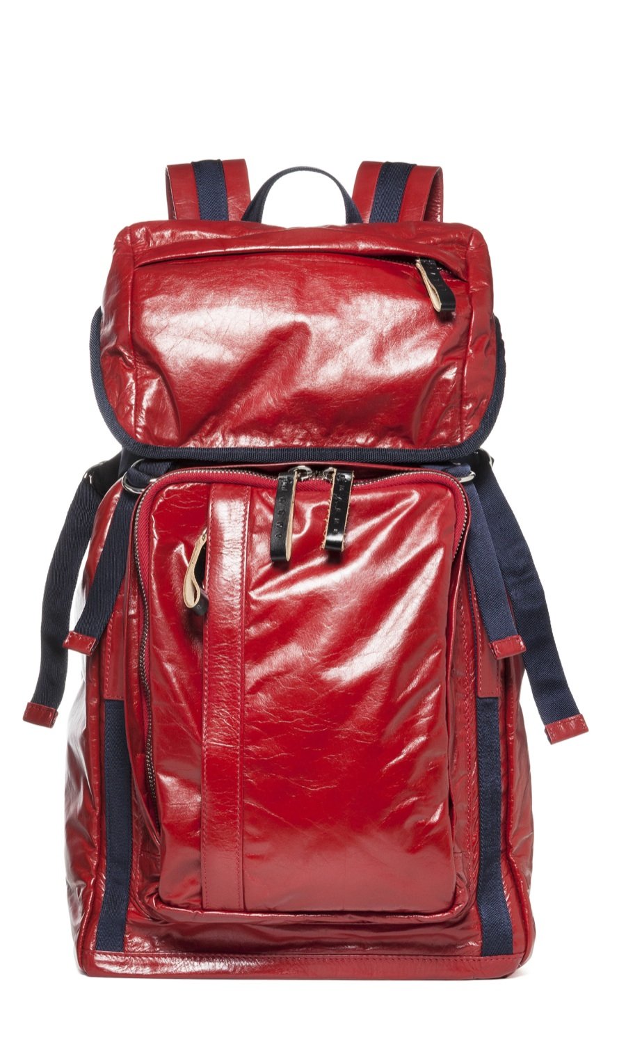 Studiati per contenere e proteggere il necessaire maschile, dall’iPad ai documenti di lavoro, si ispirano ai modelli da trekking usati in passato dagli Alpini, con lacci in cuoio e fodere in pile o alle cartelle scolastiche degli anni Settanta, con forme leggermente squadrate e strutture rigide. Diversi materiali si fondono tra loro, come il canvas cerato reso waterproof e la pelle spazzolata. Il cuoio viene dipinto a mano e sul nylon compaiono stampe mimetiche con dettagli fluo.