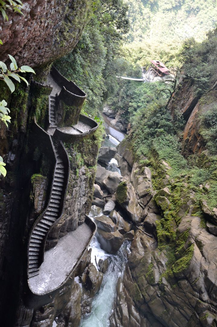 ECUADOR. Il Pailon del Diablo è una cascata che si trova sul fiume Pastaza, a soli 30 minuti dalla città di Baños. Per raggiungere la cascata basta scendere lungo un sentiero di mille metri, e poi risalire attraverso una ripidissima e scivolosissima scalinata spesso avvolta dalla nebbia. Un’avventura per turisti impavidi (hotels.com)