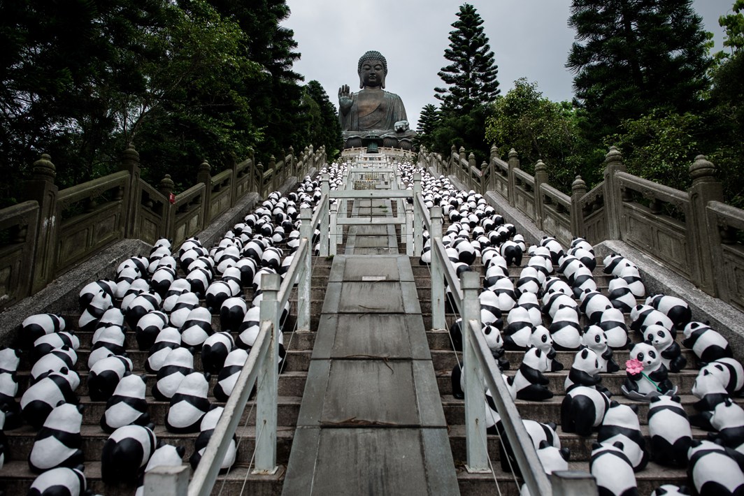 HONG KONG. Per denunciare l’imminente estinzione dei panda e sensibilizzare le coscienze, ogni anno l’artista francese Paulo Grangeon realizza, in collaborazione con il WWF, 1600 piccoli orsi bianchi e neri di cartapesta collocandoli nei posti più noti e più frequentati al mondo. Come quest’anno in cui migliaia di panda sono stati intercettati su centinaia di gradini che raggiungono la statua del Buddha Tian Tan, nell’isola di Lantau, Hong Kong (PHILIPPE LOPEZ/AFP/Getty Images)