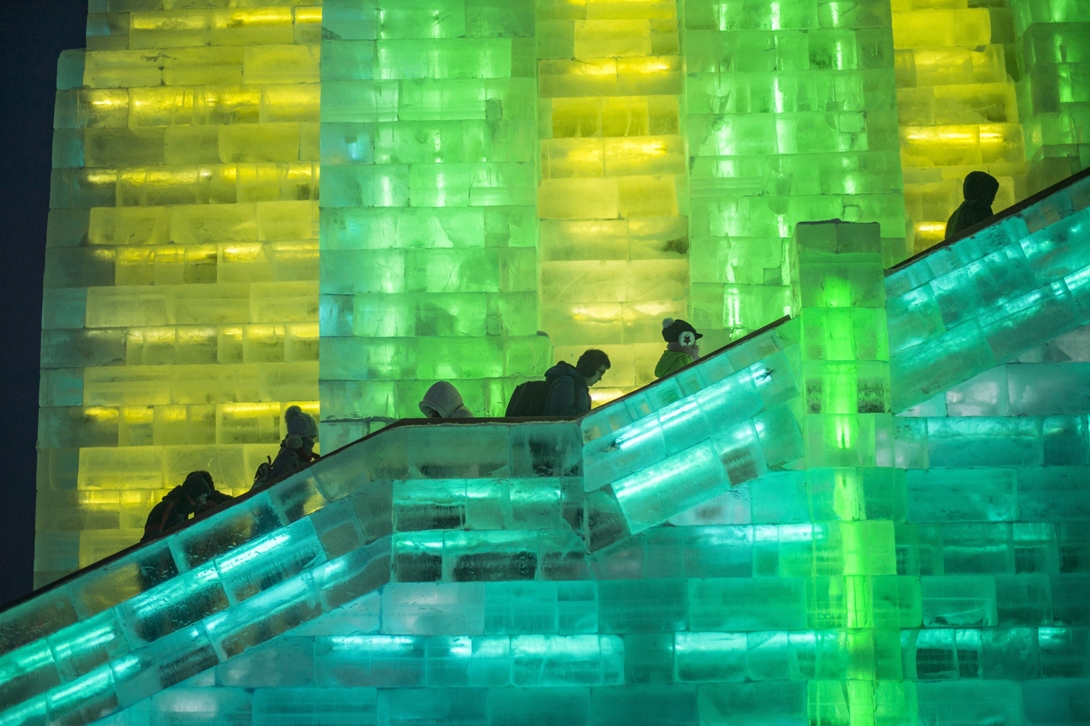 CINA. Turisti e locali lungo la chilometrica scalinata della torre di ghiaccio realizzata al China Ice and Snow World, il 16 ° Festival Internazionale delle sculture di ghiaccio che si tiene ad Harbin, a nord-est della provincia di Heilongjiang. Ogni anno, da gennaio fino a che il tempo lo consente, è possibile visitare questo villaggio che per l’occasione si trasforma in una vera e propria cittadina trasparente, impreziosita da giochi di luci (FRED DUFOUR/AFP/Getty Images)