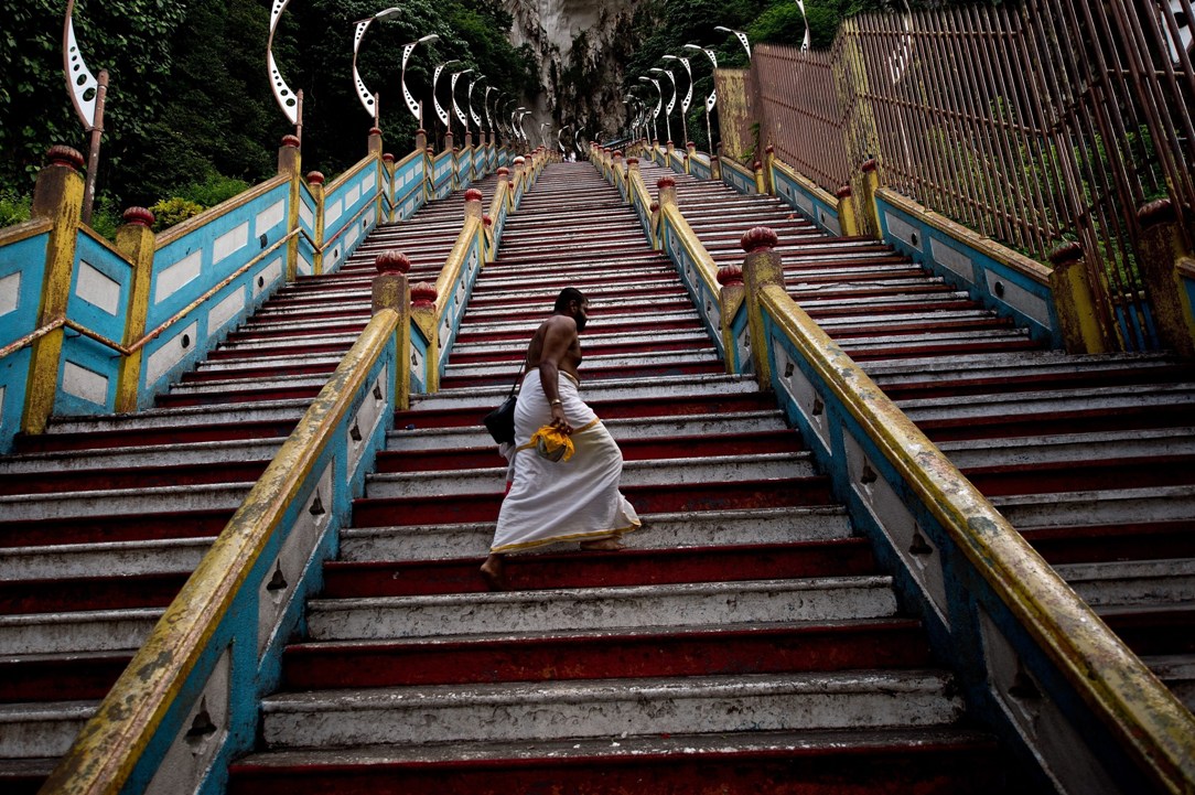 MALESIA. Un sacerdote indù sale i 272 gradini che separano la foresta dalle grotte di Batu dove si trova l’omonimo tempio, poco distante da Kuala Lumpur. Il tempio incastonato all'interno della secolare grotta calcarea è uno dei luoghi di culto indù più conosciuti al di fuori dell'India, dedicato al dio Murugan (MANAN VATSYAYANA / AFP / Getty Images)