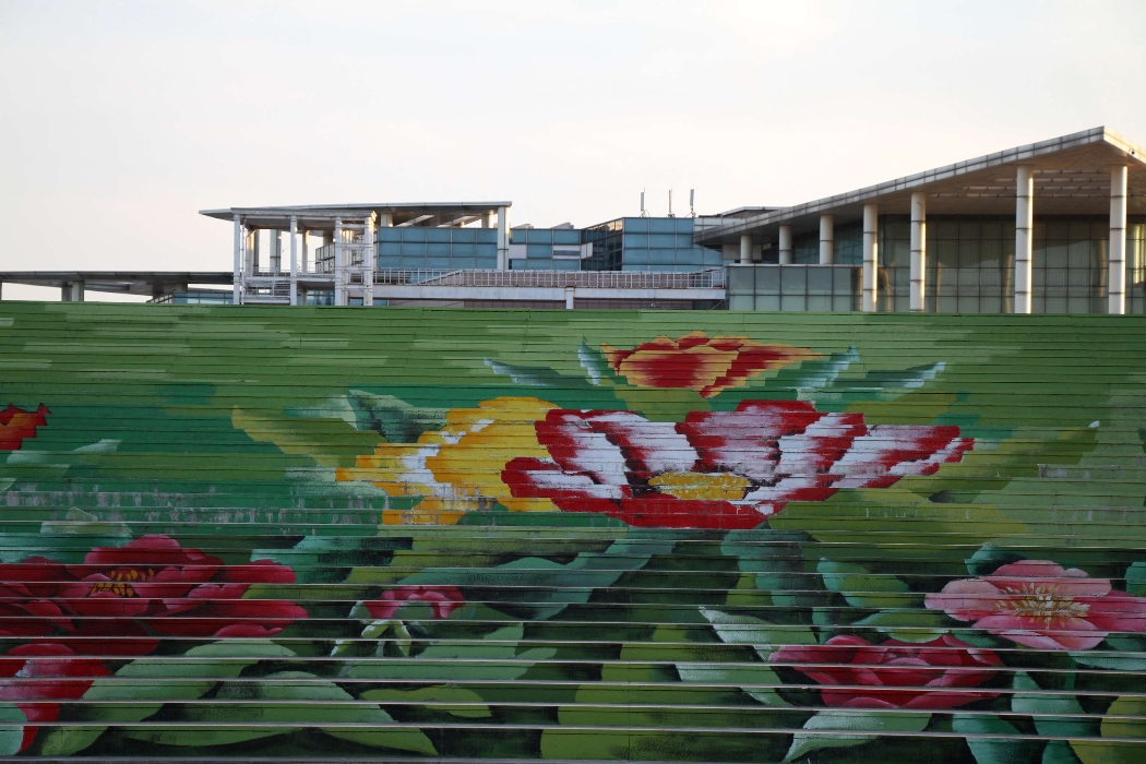CINA. La scalinata del Binzhou International Convention and Exhibition Center, della provincia cinese di Shandong, mostra il gigantesco dipinto che rappresenta una peonia. Per realizzare l’opera grande migliaia di metri quadrati su altrettanti gradini pittori locali hanno impiegato poco più di dieci giorni (ChinaFotoPress/Getty Images)