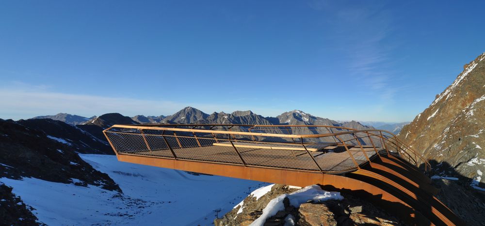 Ancora in Austria ma sul ghiacciaio dello Stubai c’è la piattaforma Top of Tyrol, 20 tonnellate d’acciaio a 3.210 di altezza, sospesa per 9 metri oltre la parete rocciosa. Ci si arriva salendo 232 scalini.