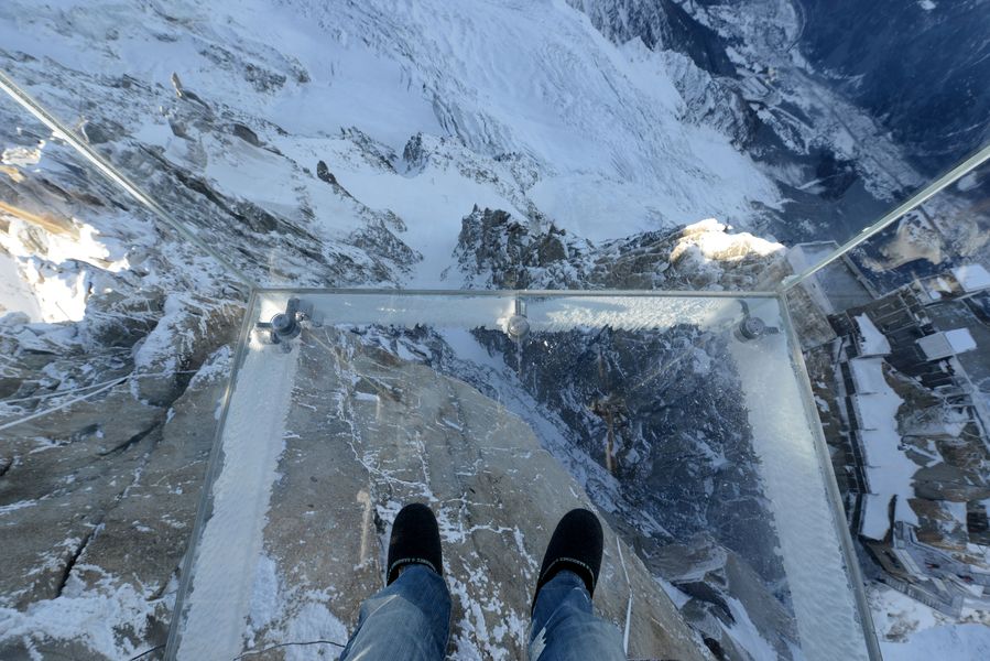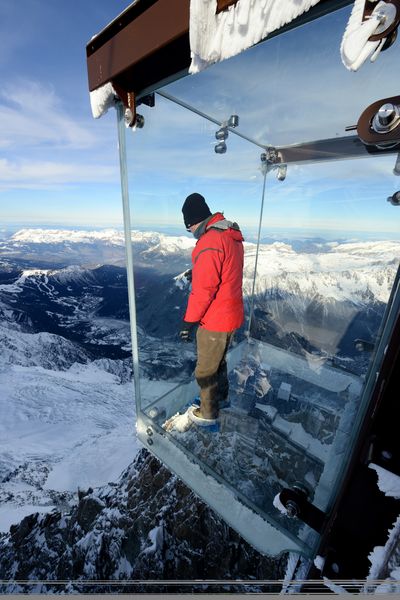 Sulle Alpi francesi c’è un altro punto panoramico da brividi: il cosiddetto ‘Step into the Void’, passo nel vuoto, un cubo trasparente a qouta 3.842 metri a Chamonix. Ci sono voluti tre anni per realizzarlo, è composto da tre strati di vetro che resistono a venti di velocità pari a 220 km orari.