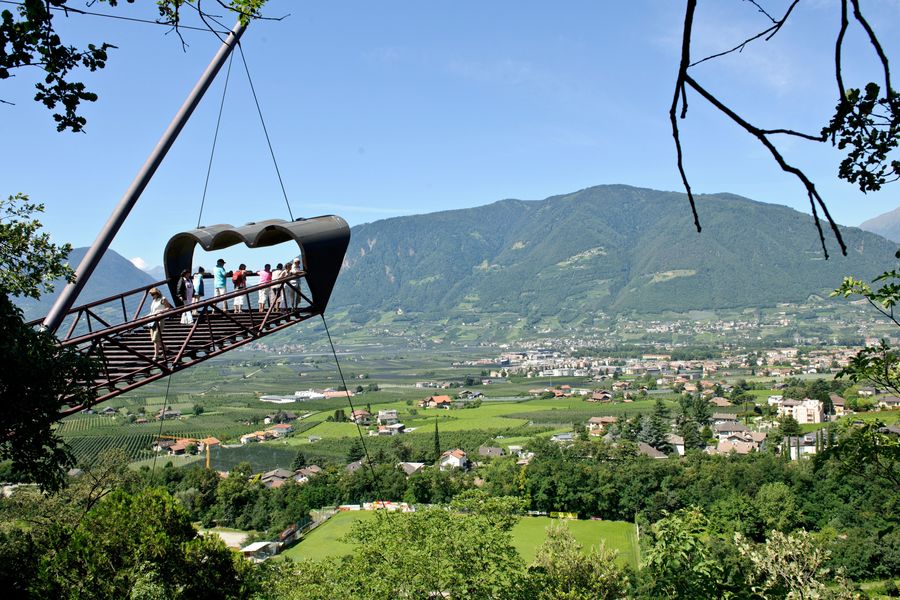 Senza andare lontano, nei Giardini di Castel Trauttmansdorff a Merano, si trova una spettacolare piattaforma panoramica, trasparente al 95%, creata dall’architetto e designer altoatesino Matteo Thun. La forma è quella di un gigantesco binocolo tridimensionale con vista sulla piana dell’Adige e la conca di Merano e con lo sfondo dei rilievi circostanti.