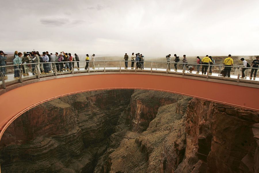 Lo Skywalk del Grand Canyon, a ferro di cavallo, si estende per oltre 20 metri dalla roccia e si trova a 1.100 metri di altezza dal suolo. Sotto, il Colorado River e il paesaggio dell’Arizona che, però, secondo alcuni, è stato rovinato da questa costruzione. In vetro e acciaio, è costato 40 milioni di $ e l’ingresso costa 75$ a visitatore. Si trova a 190 km da Las Vegas.