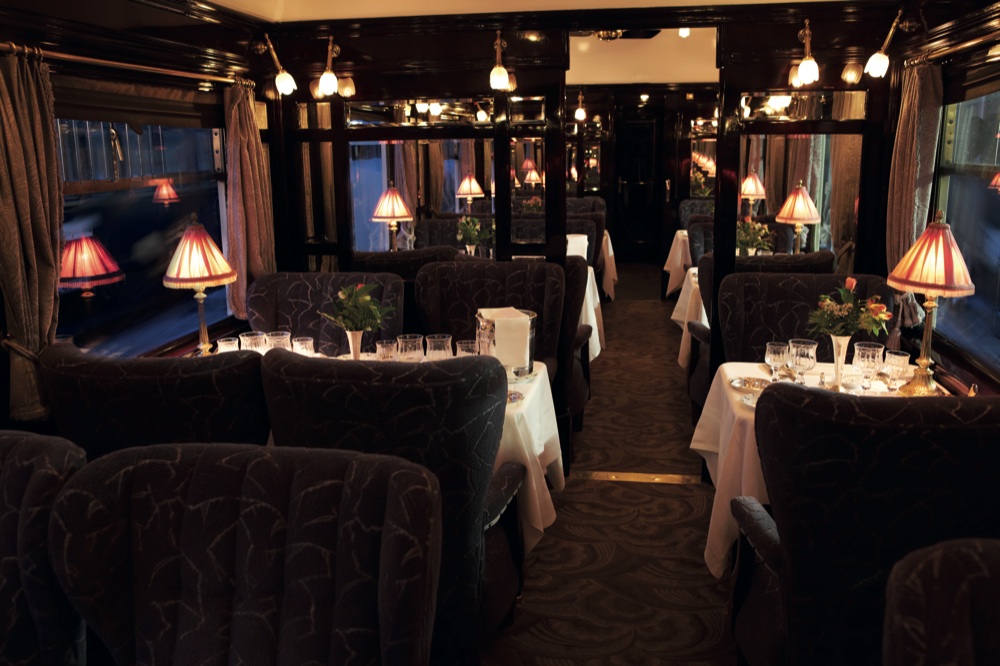 Ci sono tre carrozze ristorante: La Côte d’Azur, con i suoi pannelli in vetro di Lalique, la Etoile du Nord con i suoi eleganti intarsi, e L’Oriental, decorata in lacca nera. Il servizio è eccellente e la cucina si avvale dei migliori chef internazionali (belmondimages.com)