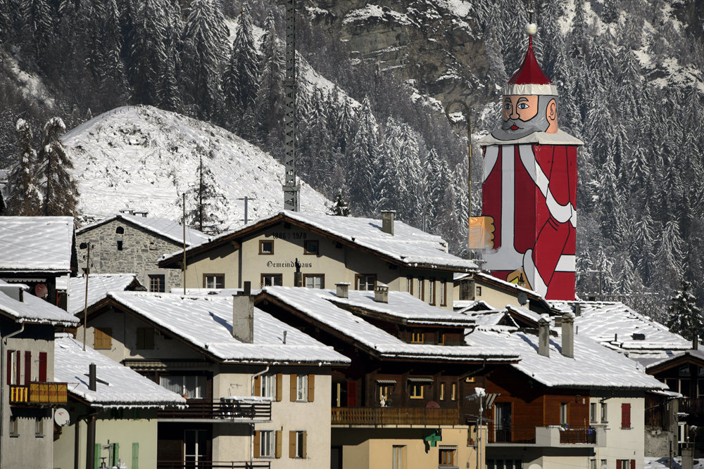 Il paese svizzero di St. Niklaus, Santa Claus in tedesco, vicino Zermatt, rende omaggio al suo patrono trasformando il campanile della chiesa, databile a oltre 350 anni fa e alto 36,5 metri, nel più grande pupazzo di Babbo Natale del mondo, entrato nel Guinnes dei primati nel 1998.