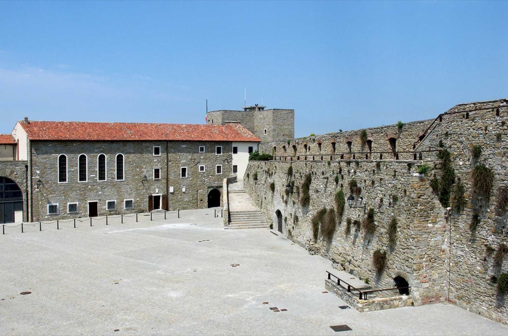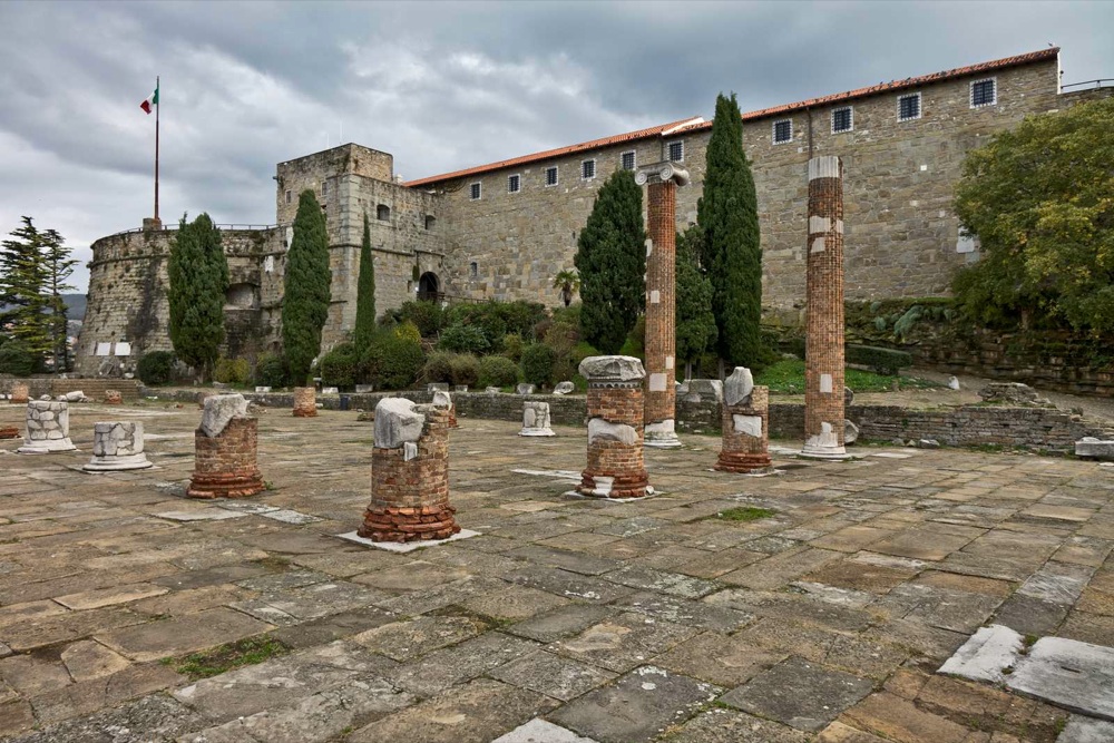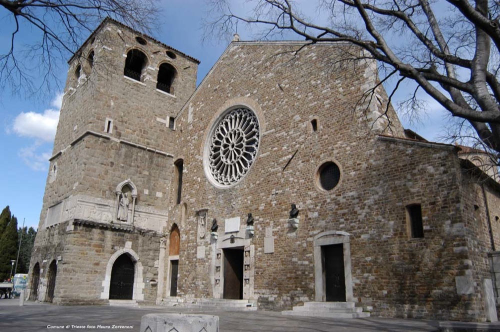 Il colle di San Giusto Dando le spalle al mare, a circa 1 km a est da Piazza dell’Unità, si raggiunge il più importante edificio cattolico cittadino, la Cattedrale di San Giusto (XIV secolo). Sorge sui resti di una basilica paleocristiana a tre navate, con il presbiterio absidato e il pavimento a mosaico, i cui scarsi resti sono stati poi incorporati nel pavimento dell’attuale costruzione.
