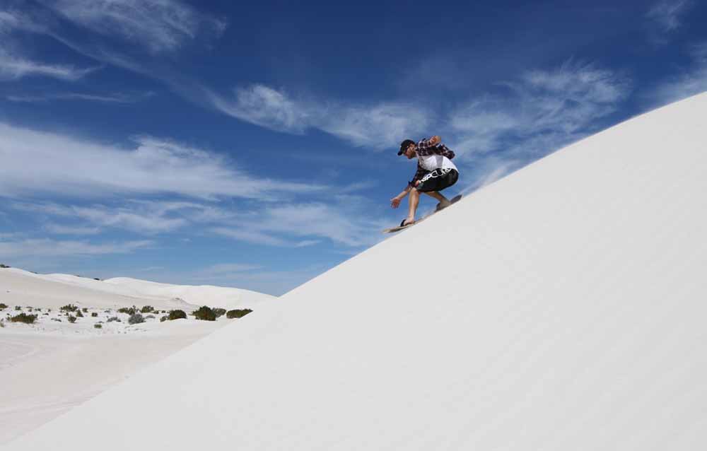 A Lancelin si può fare sandboarding: è come il surf, ma si fa su magnifiche e soffici dune di sabbia bianchissima di deserto e poi ci diverte nella cittadina che sta divenendo sempre più di moda, con localini carini anche sulla spiaggia.