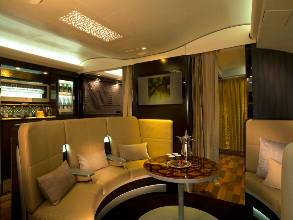 Gli ospiti in First e Business Class dell’Airbus A380 hanno la possibilità di rilassarsi e socializzare nella lobby, ovvero un salottino situato tra le due classi e allestito con una zona bar, un divano in pelle semi- circolare, un tavolo intarsiato e un televisore con maxi-schermo con porta USB che permette la condivisione di contenuti.