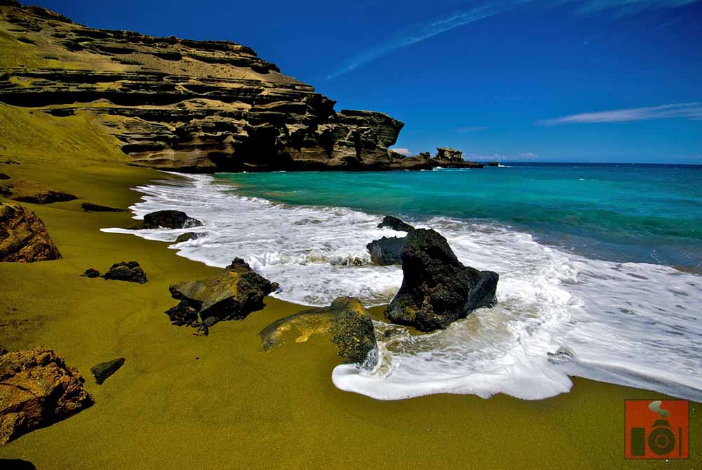 Un’altra esperienza unica è raggiungere a piedi la Green Sand Beach, una spiaggia che ha fama di essere di piccolissimi sassi verdi, all’interno dell’Hawaii Volcanoes National Park, caratterizzato da un paesaggio lunare di lava che si interrompe nel blu intenso dell’oceano.