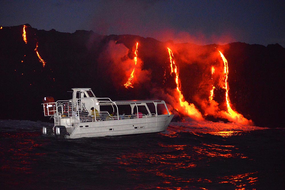 Se si vuole entrare a stretto contatto con la potenza incontenibile della natura bisogna recarsi alla Big Island, l’isola più selvaggia. Qui la mattina all’alba c’è la possibilità, con il Lava Sunrise Boat Tour, organizzato da Lava Oceans Tours, di andare, tramite una veloce imbarcazione che sfida le onde, ad ammirare la lava che cade nel mare, oltre che tutta la costa lavica creata dal vulcano Kilauea.