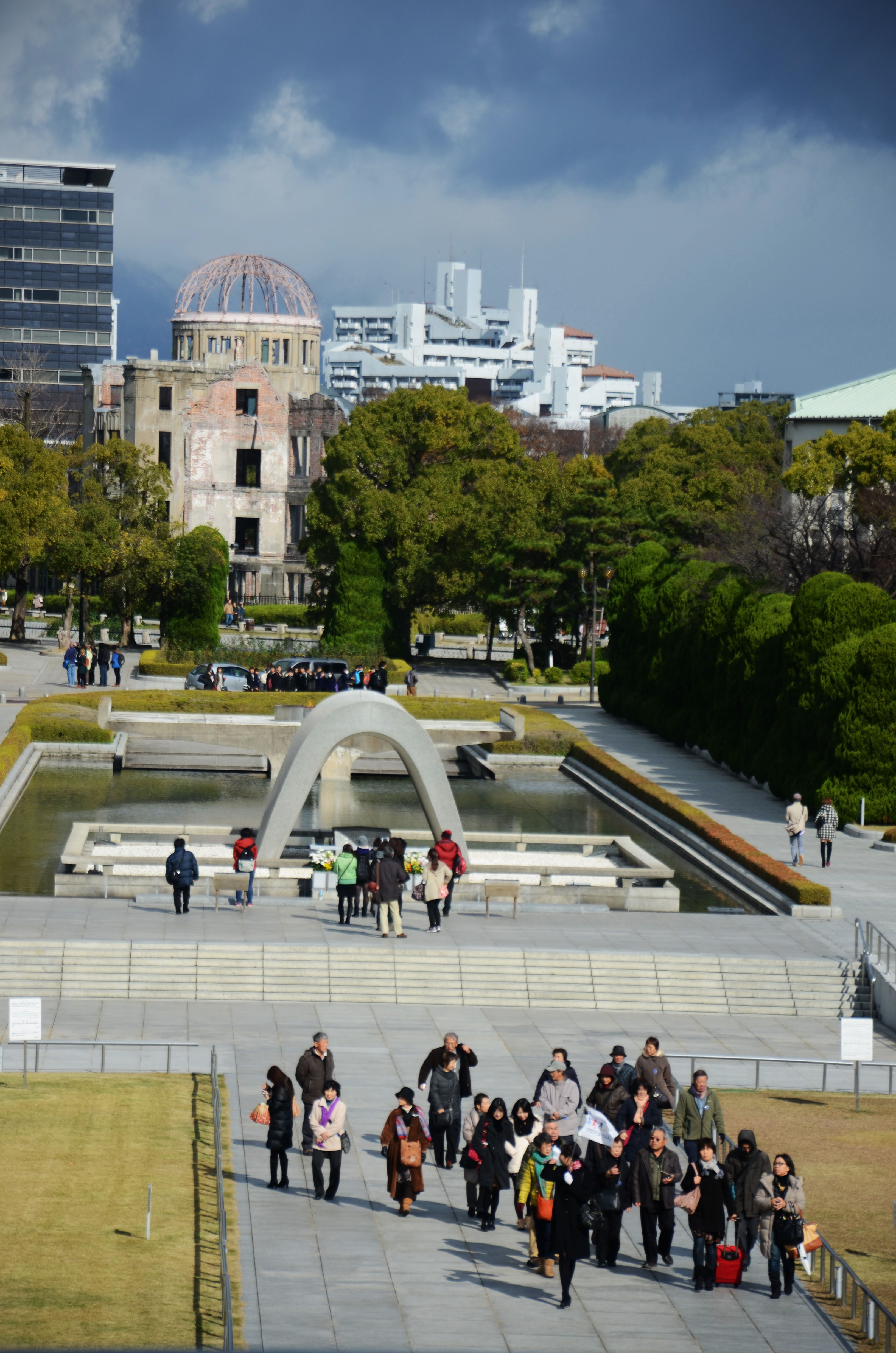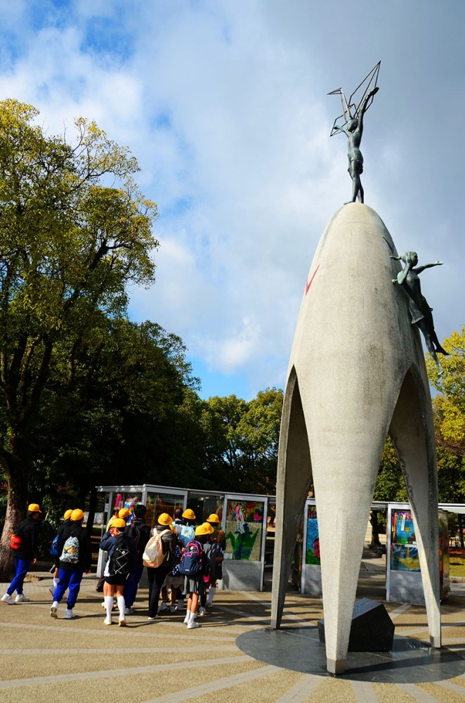 Nel Parco che sorge sulle rive del Motoyasu-gawa River, gli studenti tengono il viso incollato alle teche contenenti le gru di carta che Sasaki Sadako, malata di leucemia per colpa della bomba atomica, ha ricevuto in dono da migliaia di suoi connazionali, quando si seppe che la bimba era convinta di raggiungere la guarigione qualora avesse raggiunto il migliaio di origami: non ce la fece e così tutto il Giappone volle comporre queste creazioni di cartoncino colorato in suo ricordo. Tanti simboli, monumenti nel Peace Park, che rappresenta però anche un luogo di ritrovo, un prato sul quale stendersi e consumare il bento, il pranzo contenuto nel tradizionale contenitore a scomparti di cibo che contiene solitamente riso, sashimi, sottaceti, sushi e verdure cotte.