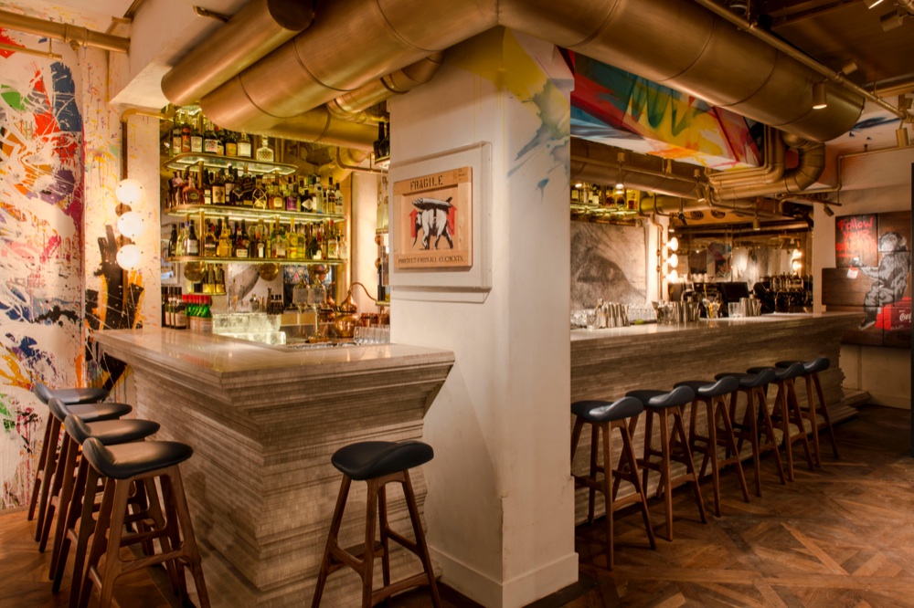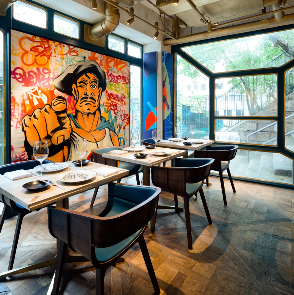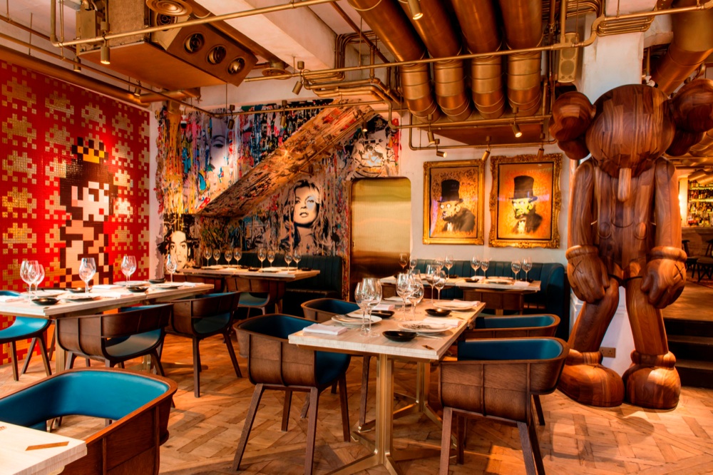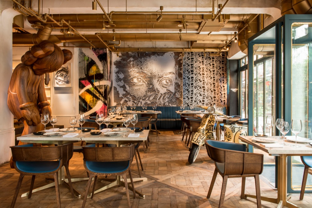 L’arte qui è protagonista, alle pareti e nei piatti. Questo ristorante e lounge bar è unico e originalissimo. Ricavato da un edificio degli anni 30, un tempo sede della Compagnia generale francese dei tram poi abbandonata, l’ampio locale sotterraneo divenne per lungo tempo il luogo preferito da artisti di strada. Da un paio d’anni è un hotspot di Hong Kong per una serie di motivi. Innanzitutto, per il piacere di trovarsi in una vera e propria galleria d’arte, dove è bello mangiare o sorseggiare un cocktail facendo correre lo sguardo lungo le pareti o alla ricerca di una scultura. Ovunque infatti si è attorniati da innumerevoli opere di grandi artisti internazionali e locali: Bansky, Damien Hirst, Jeff Koons, Takashi Murakami per citare solo i più noti tra gli oltre trenta presenti. Ma l’arte è anche nei piatti, grazie al lavoro dell’executive chef Mutaro Balde, proveniente dalle cucine di Alain Ducasse e Joel Robuchon e per questo specializzato in piatti francesi.